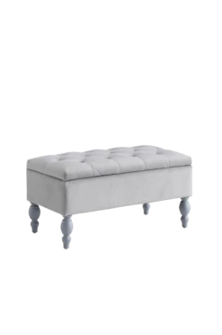 Förvaringsbänk med klädsel i polyestersammet och trästomme. Stoppning av polyeter. Träben. Förvaringsutrymme i bänken, uppfällbart lock med gångjärn och gasfjädrar som gör att locket öppnas och stängs mjukt och dämpat utan klämningsrisk. Bredd 80 cm, djup 40 cm, höjd 40 cm. Mått invändigt: 30×70 cm. Frihöjd 16 cm. Max viktbelastning 130 kg. Lev. monterad.