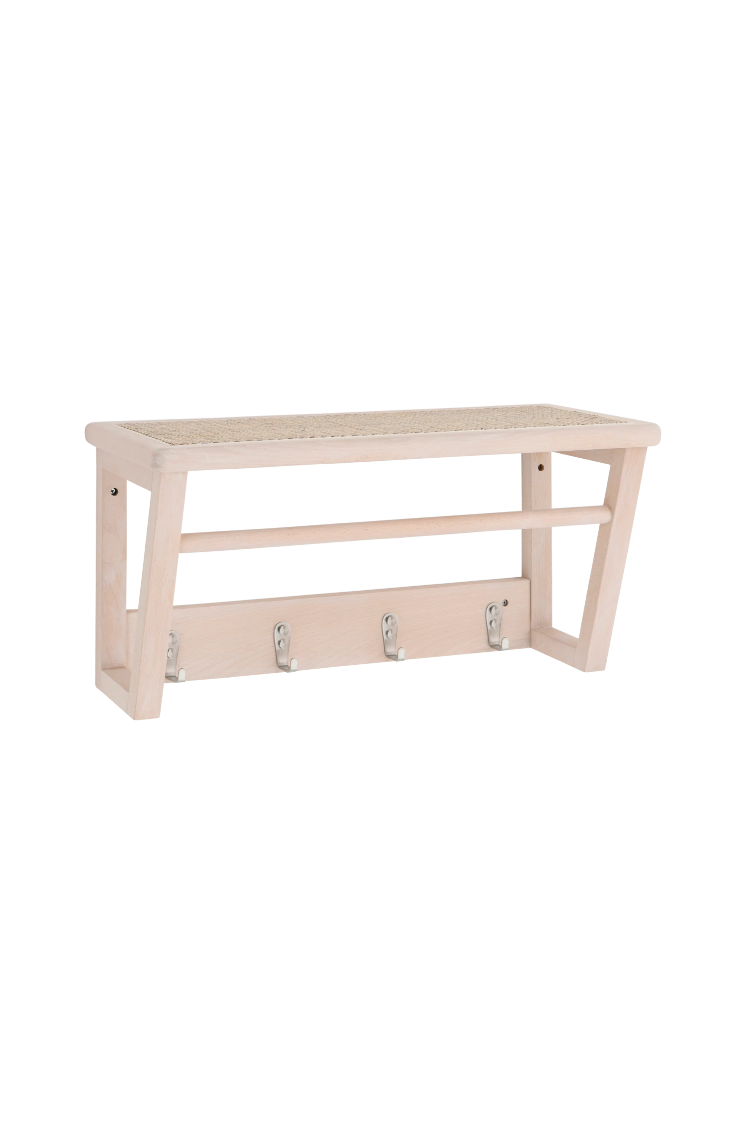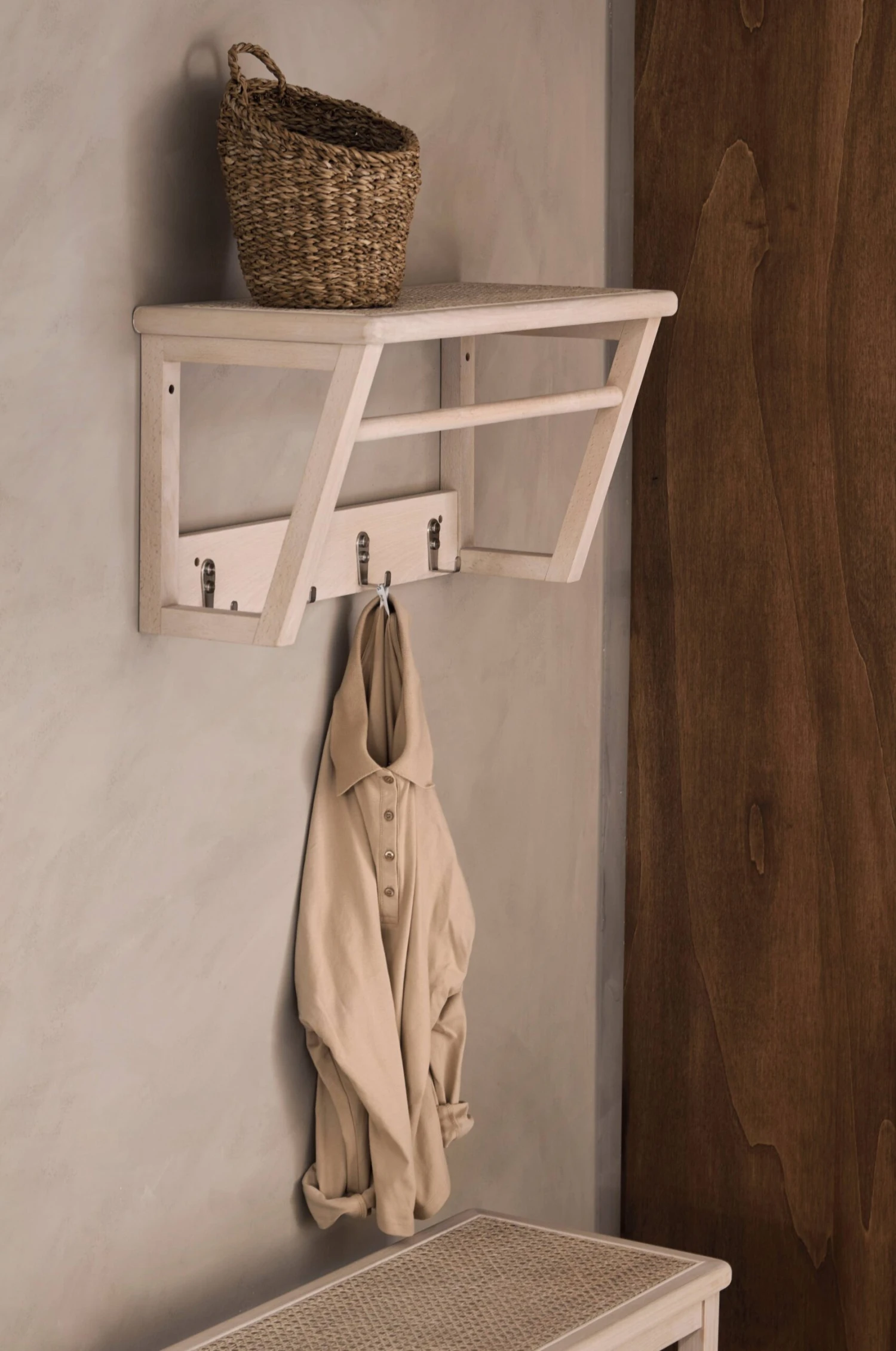 Hatthylla i massiv, vitlaserad bok och naturrotting. 4 krokar i metall. FSC-certifierad produkt, vilket innebär att den innehåller trä som är avverkat från ett ansvarsfullt skogsbruk som tar hänsyn till människor och miljö. Monterad.