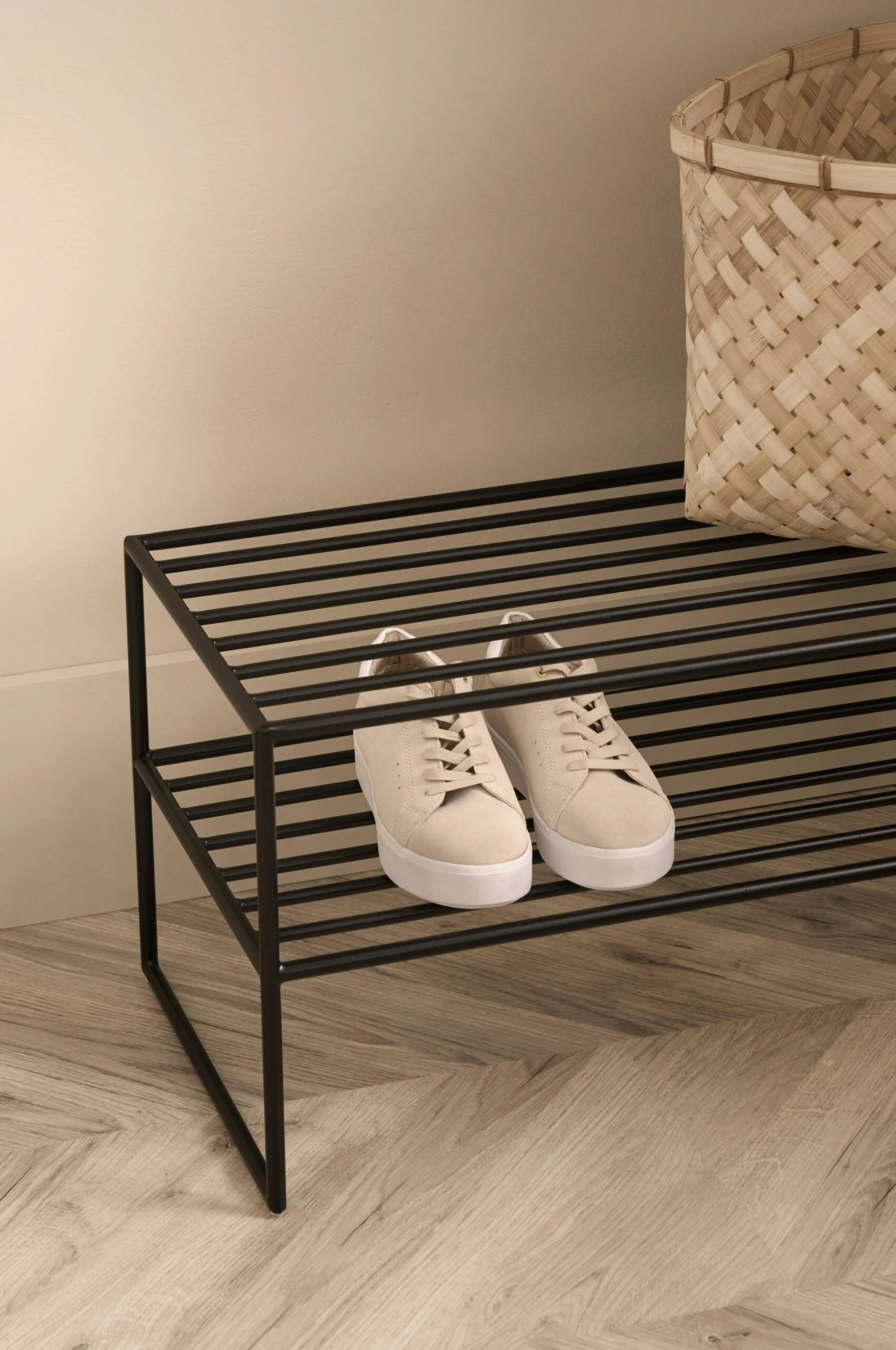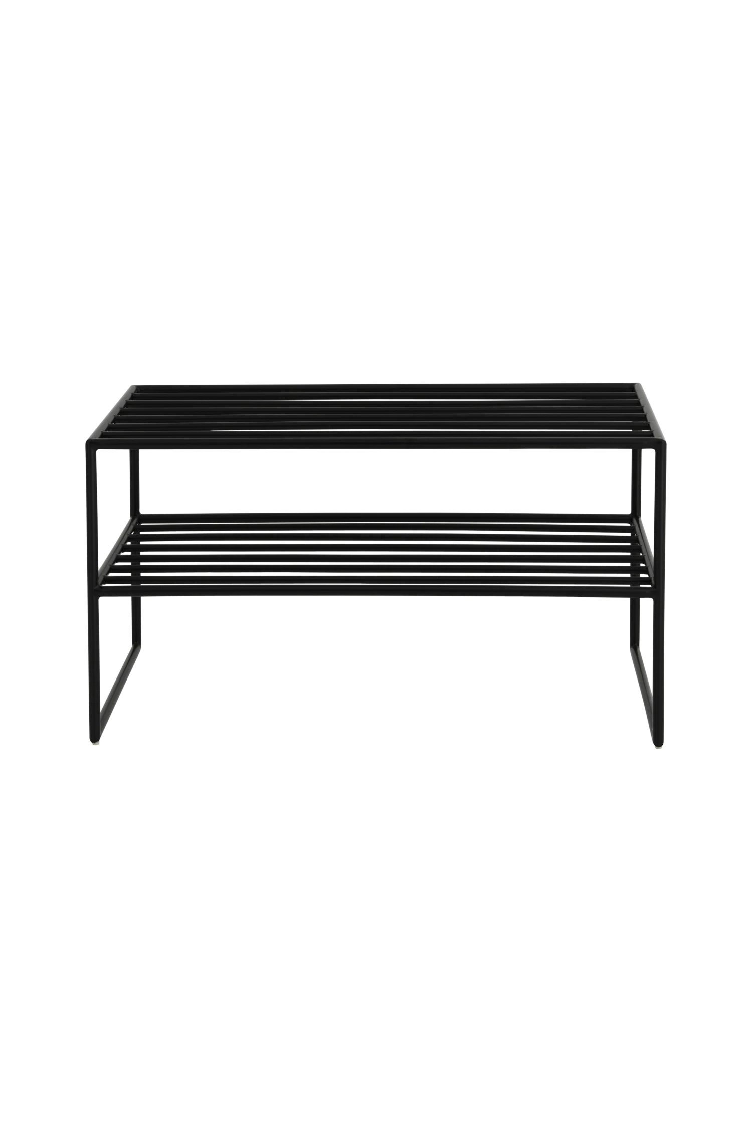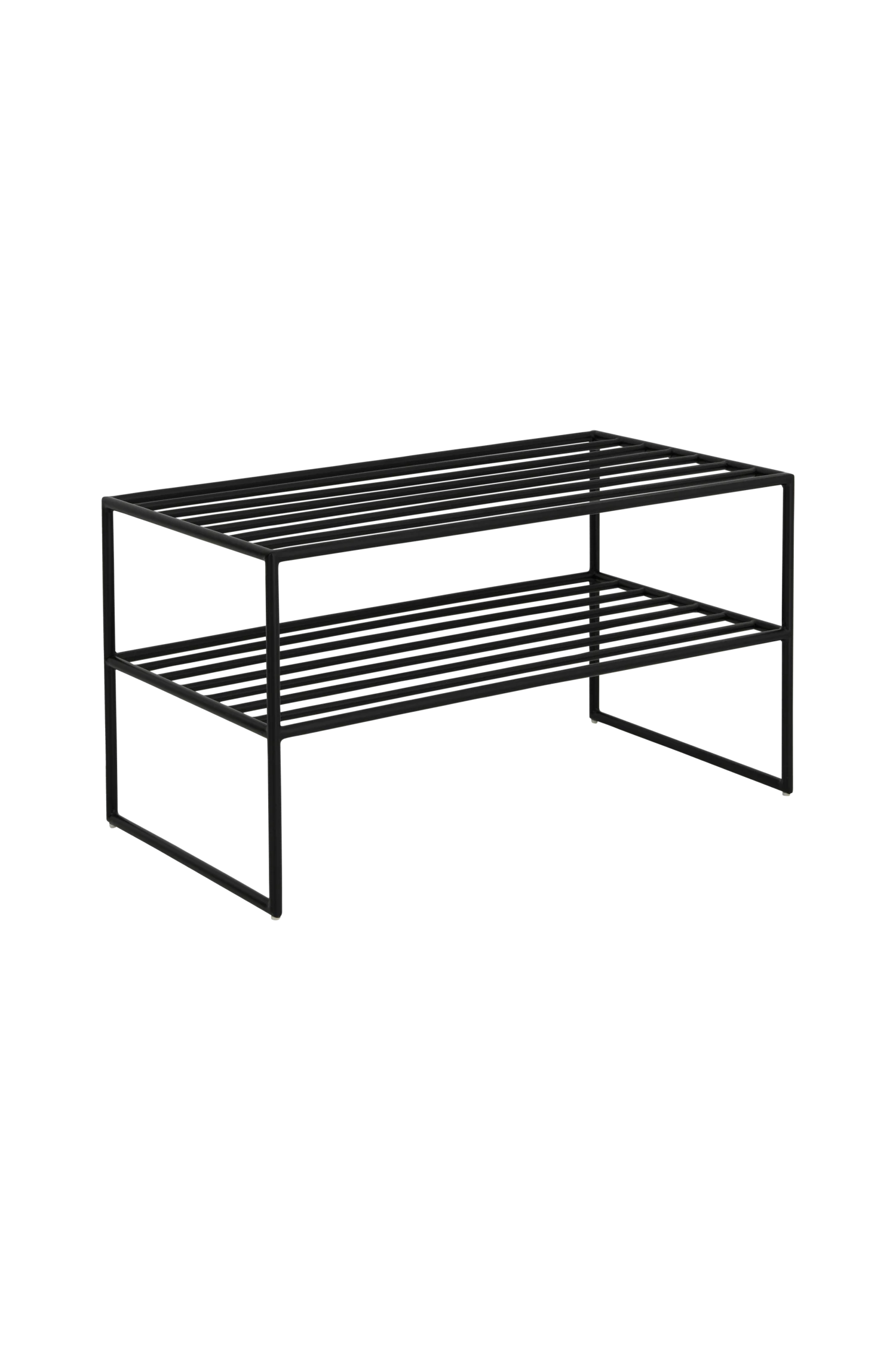 Skohylla i pulverlackad metall med 2 hyllplan. Höjd mellan hyllplanen 15 cm. Frihöjd under hyllan 17 cm.