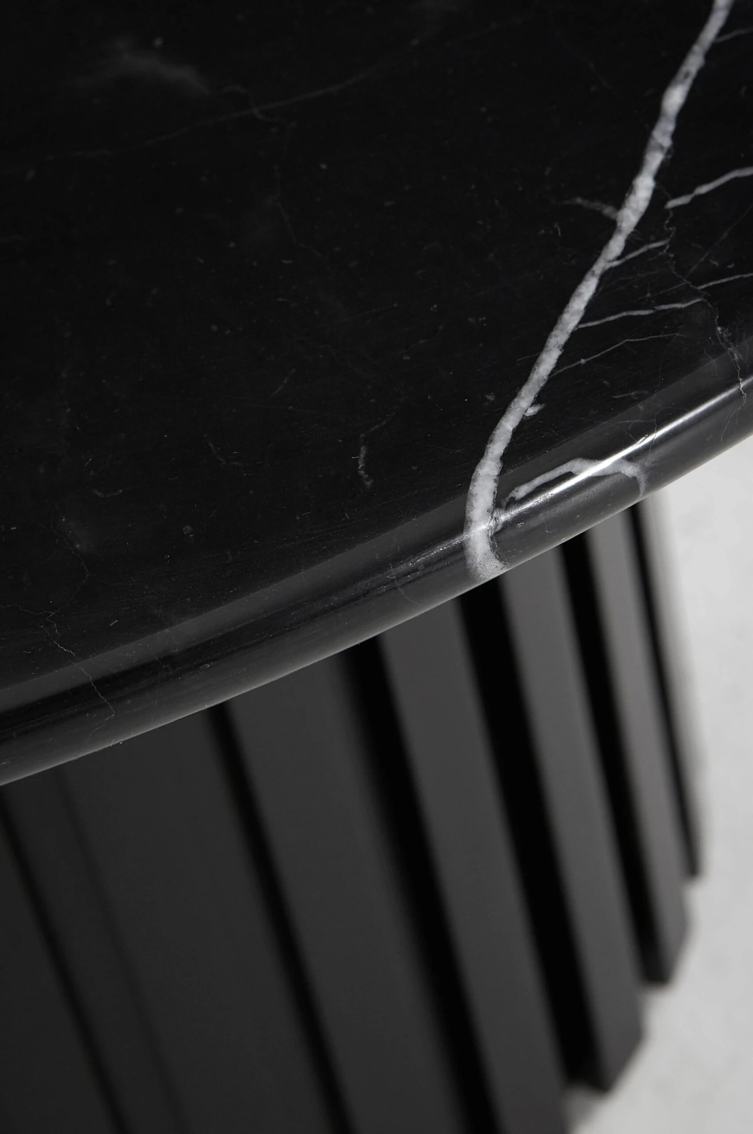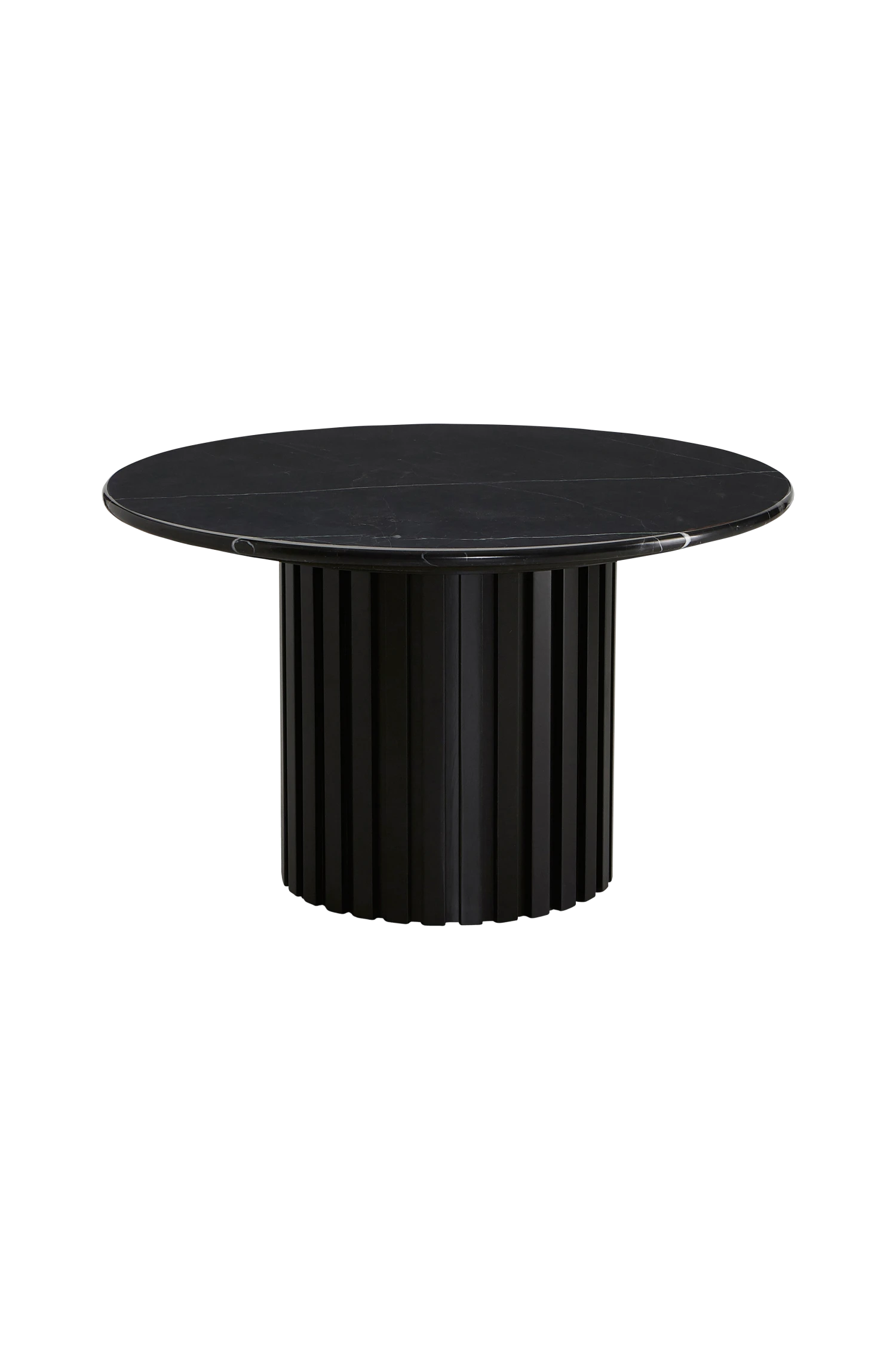 Soffbord med skiva av marmor och underrede av furu med lackad MDF. Levereras i två delar. Enklare montering. Höjd 48 cm. Ø 80 cm.