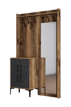 100% SPÅNSKIVA MED MELAMINBELÄGGNING Tjocklek: 1,8 cm Ben, handtag och hängare av metall Bredd: 120 cm Höjd: 200 cm Djup: 35 cm Klädhängare Flera hyllplan Kan fästas i väggen