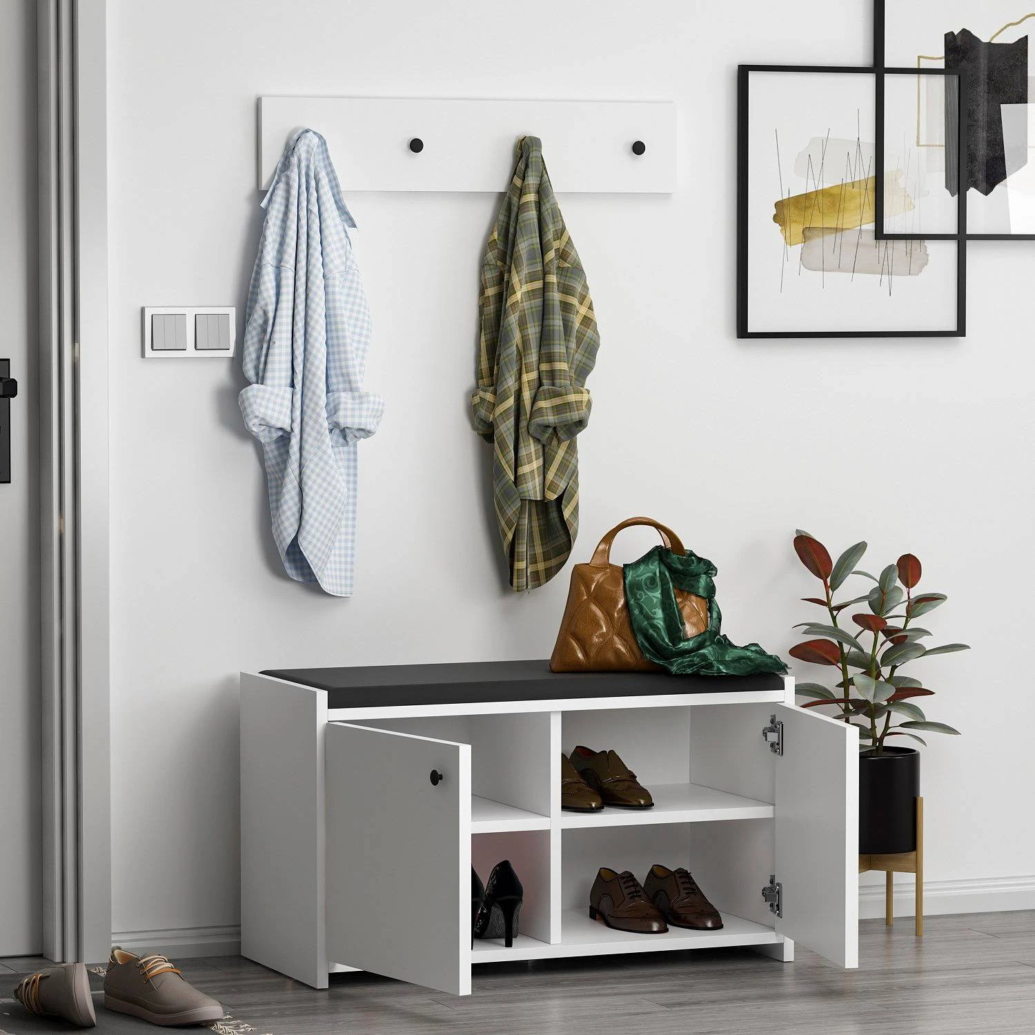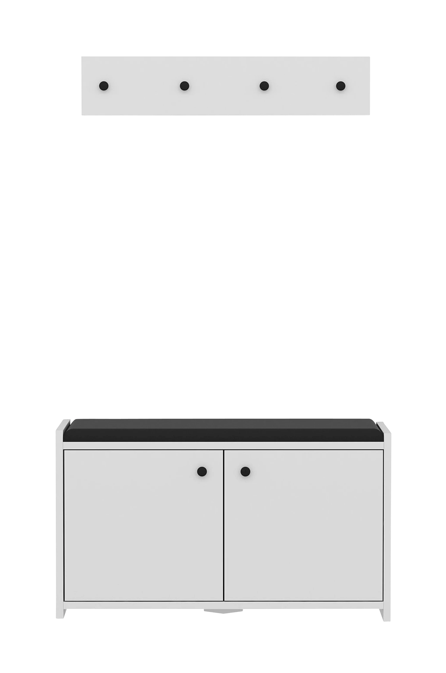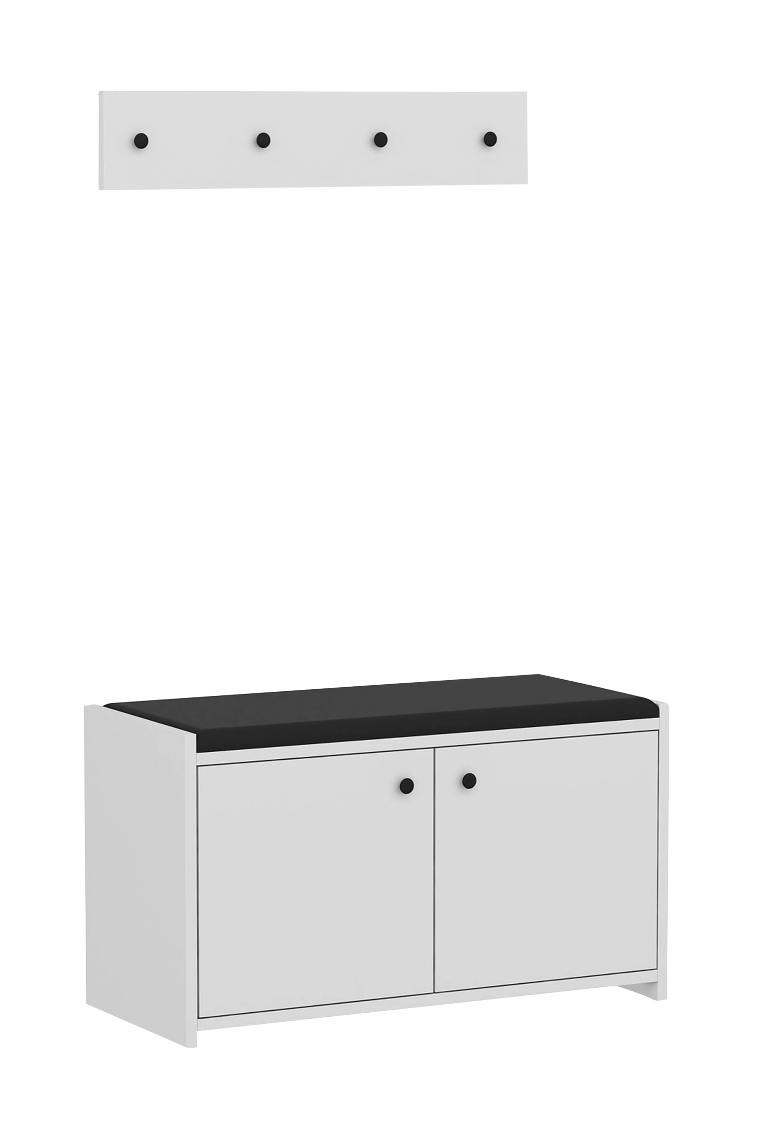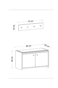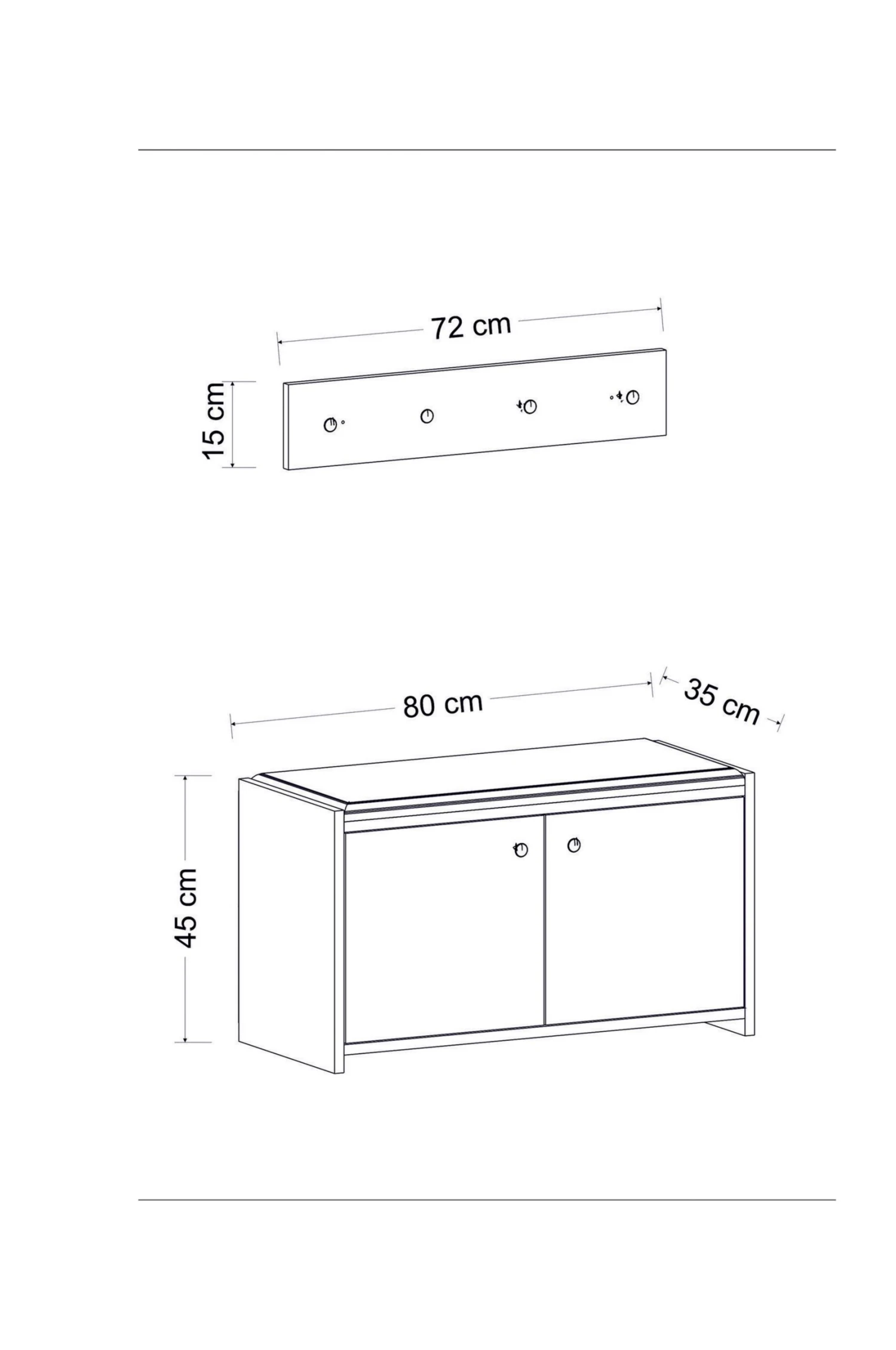 100% SPÅNSKIVA MED MELAMINBELÄGGNING Tjocklek: 1,8 cm Elektrostatisk, ugnstorkad färg Kantlister av PVC Skåp: Bredd: 80 cm Höjd:45 cm Djup: 35 cm 2 lådor Hängare: Bredd: 72 cm Höjd: 15 cm Flera hyllplan Kan fästas i väggen