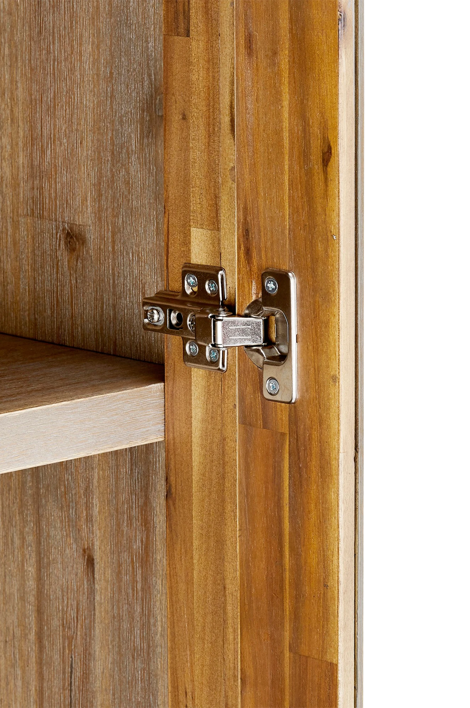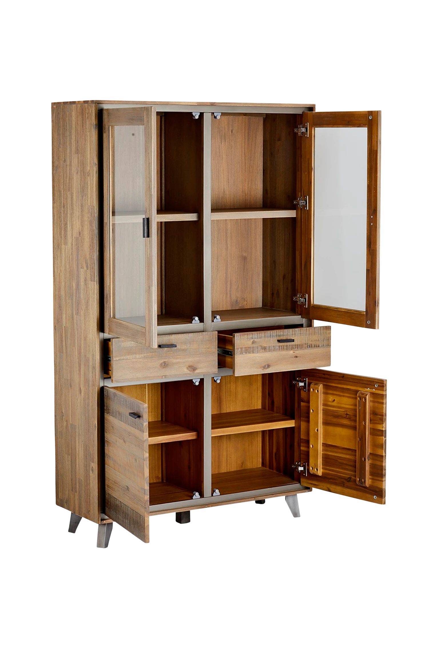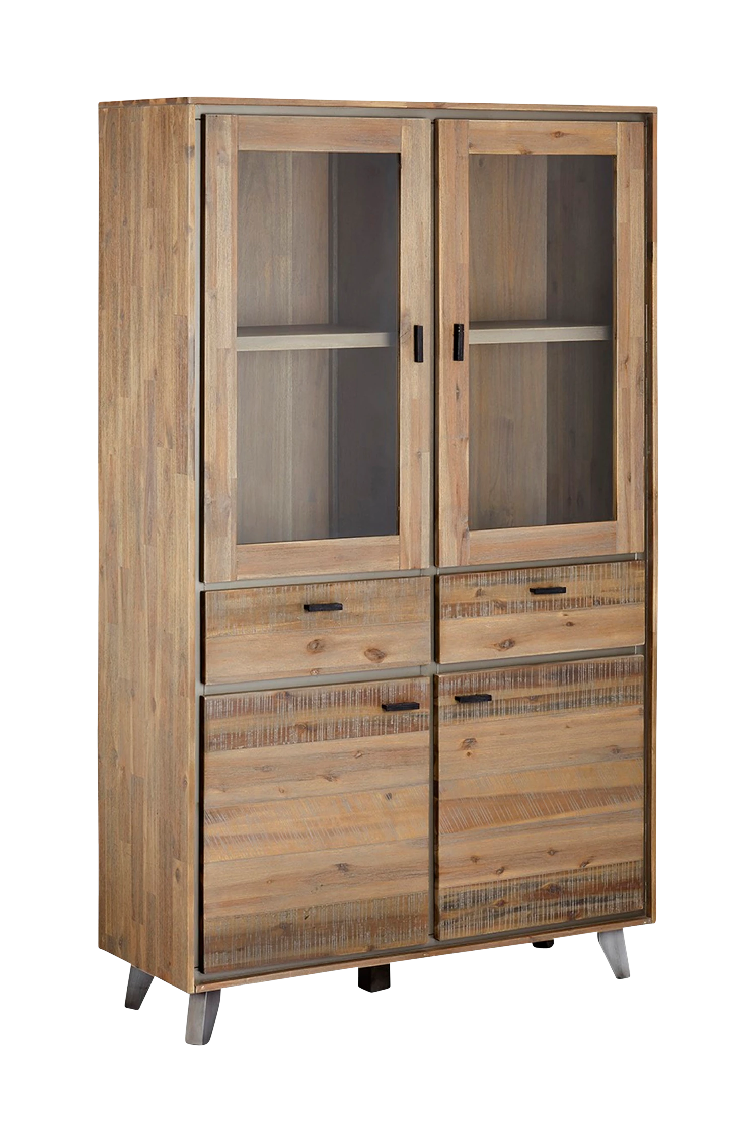 100% NATURAL PRODUCT made of 80% solid acacia wood and 20% acacia veneer DURABLE DOUBLE METAL RUNNERS: They enable the full pulling out of the drawers and last numerous longer DIMENSIONS (LxWxH) in cm: 110x40x187, Number of shelves/drawers: 2 shelves/2 drawers, Legs height (cm): 12 EASY maintenance: Once a year treat the surface with a natural oil finish ALREADY ASSEMBLED: The glass cabinet is ready to be used immediately 2 YEARS WARRANTY AND FULL SERVICE AFTER SALE Properties: Natural product Metal handles Solid Acacia Corpus Landhaus style Brushed surface Glass doors Scandinavian design Decorative framing No assembly required Smooth edges Easy care Dimensions (cm): W: 110 D:40 H: 187 Weight: 89 kg Number of shelves/drawers: 2 shelves/2 drawers Legs height (cm): 12 Shelf thickness (mm); 15 Top,Legs; side,drawer: Solid acacia; back,bottom,shelves: MDF-Veneer Tempered glass Care Instructions: Natural clear oil. No colourings. Acacia is hardwood, coming from the fast-growing trees of tropical forests of East Asia and South America, from where it has spread to other continents. The soft flame texture and olive brown to grey-brown shades with darker stripes give this wood furniture a beautiful, warm look. Acacia is characterized by resistance to peeling and biological degradation under proper handling. Acacia wood is a particularly durable type of hardwood that will be appreciated for a long time in your interior. Especially fine grain, flame drawing and changing colour shades give the furniture a tough and warm look. The surface of the furniture is finely brushed, which is a very modern, practical, sought-after wood finish that emphasizes the structure, drawing and overall appearance of a solid piece of furniture.