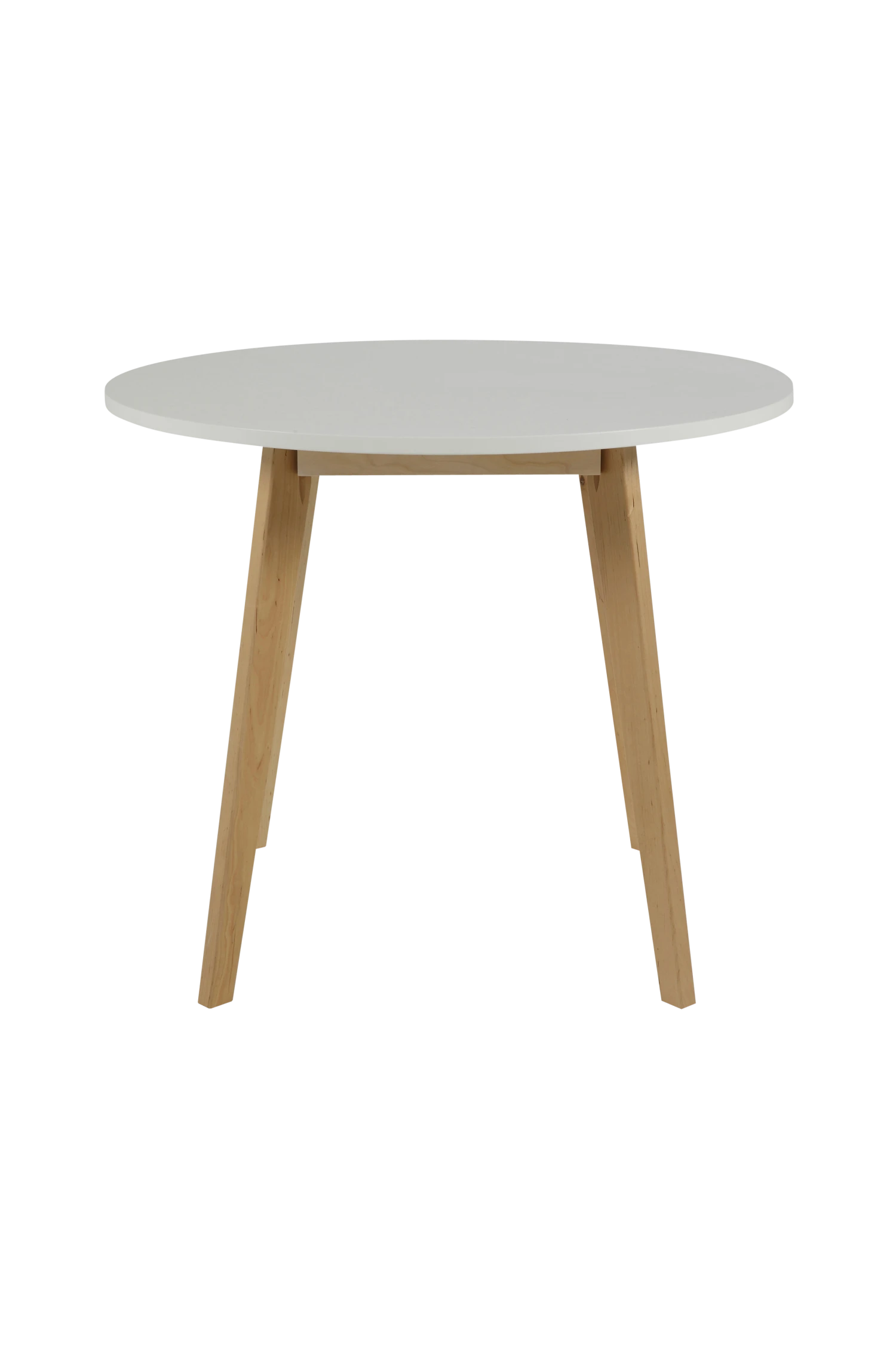 Runt träbord i björk med vitlackerad bordsskiva och ben i lackad björk. Passar perfekt i köket, gärna ihop med Elias stol. Montera själv.