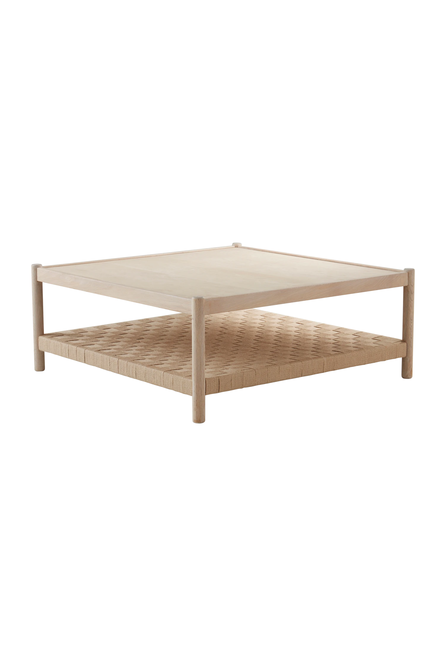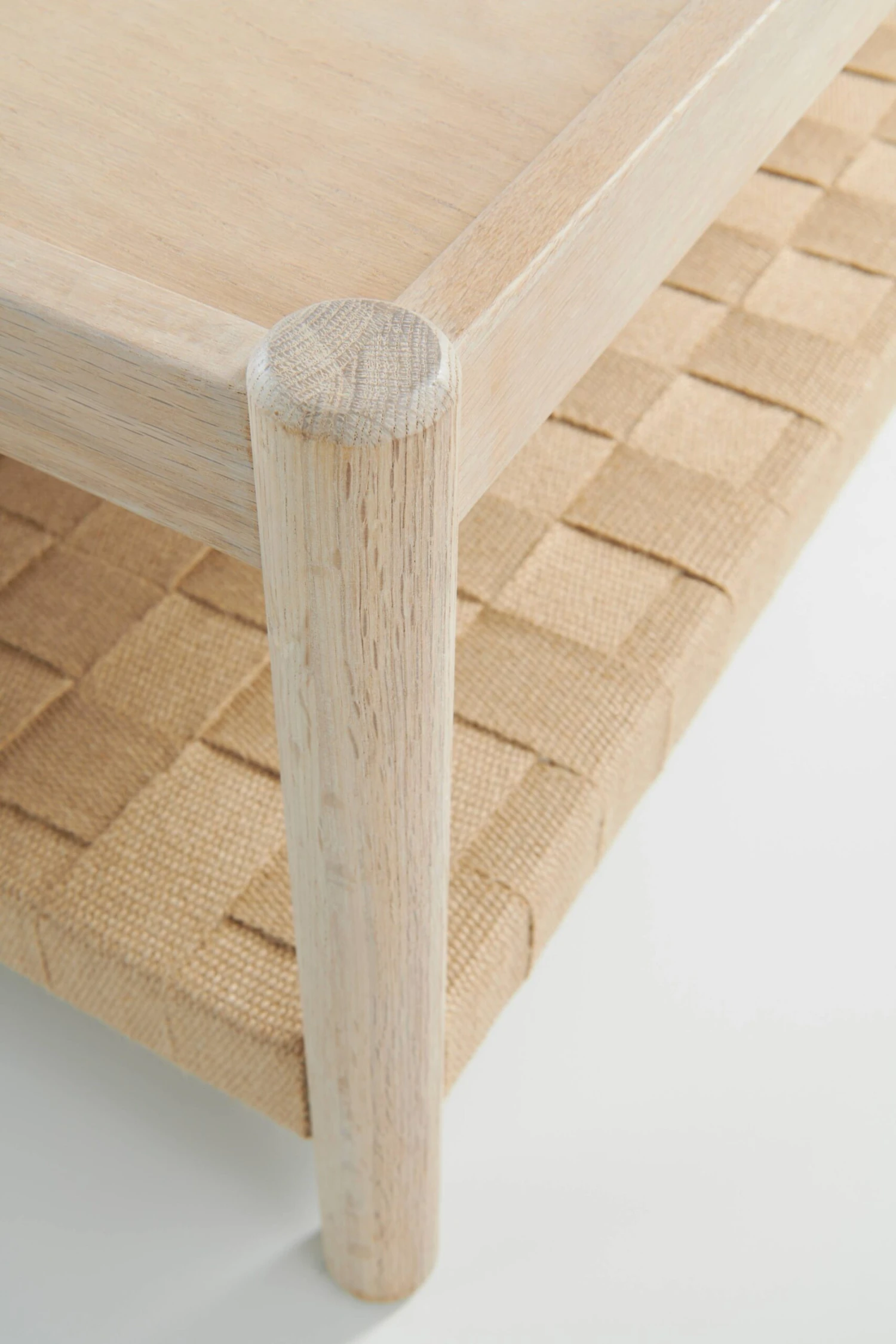 Soffbord av ek med vitsåpad finish. Bordsskivan är av MDF med ekfaner och kanten runt om är av massiv ek. Benen är av massiv ek. Bordets underdel är av flätad jute som blir en snygg detalj som sticker ut. Ramen runt om är även den i massiv ek. De snyggt formade benen förstärker den skandinaviska känslan. Viss montering krävs, monteringsanvisningar medföljer.