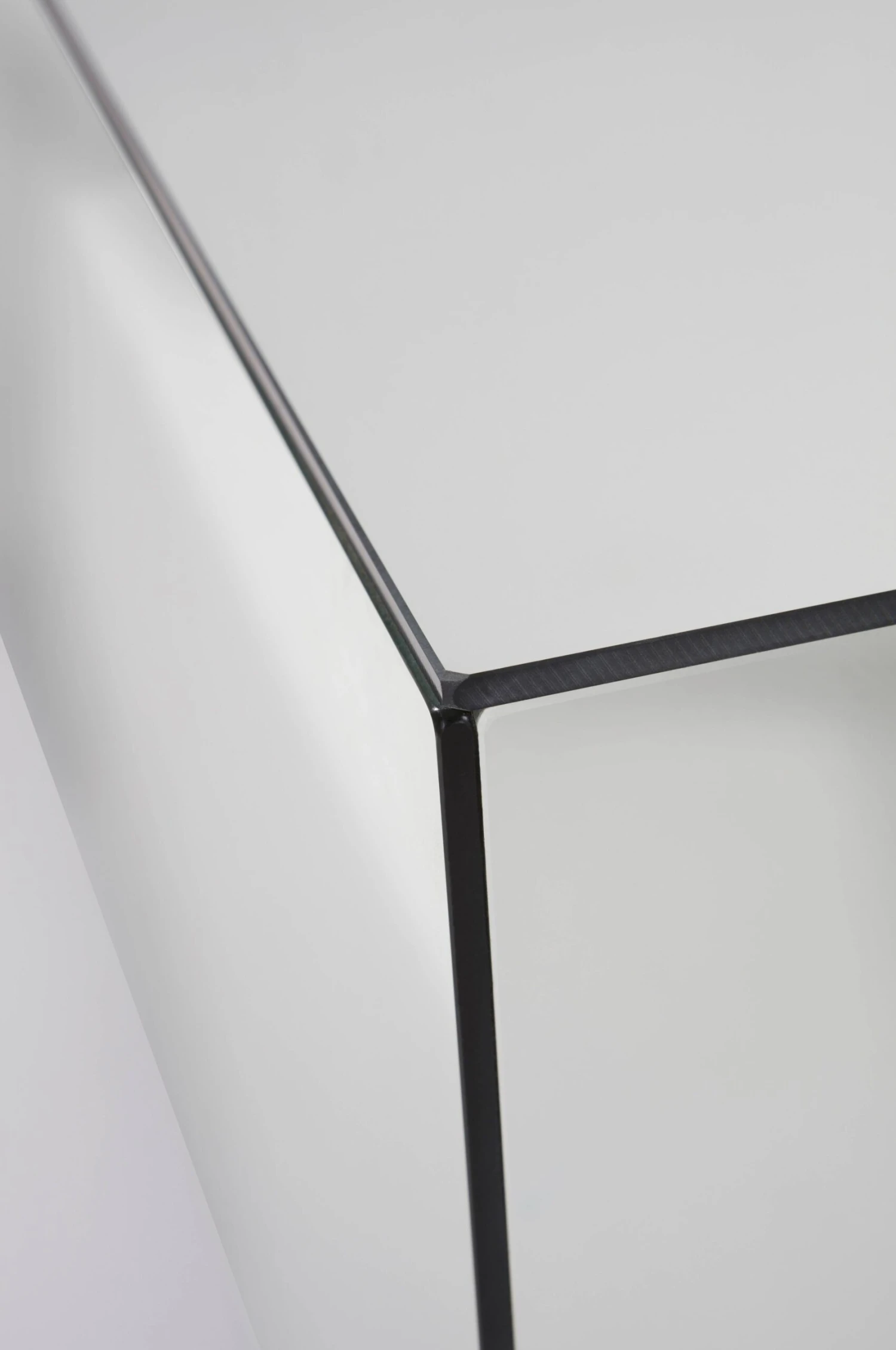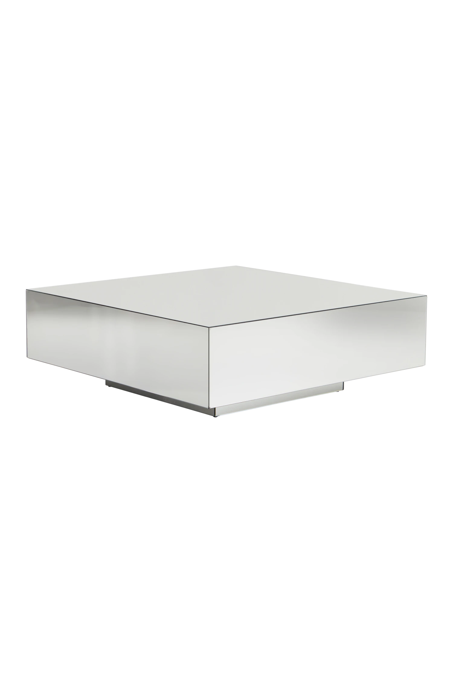 Soffbord av spegelglas med stomme av FSC-märkt MDF. Spegelbordet ger spännande effekter och kanterna har en svart sofistikerad fog. Bordet har en liten sockel av glas som ger det en svävande känsla.