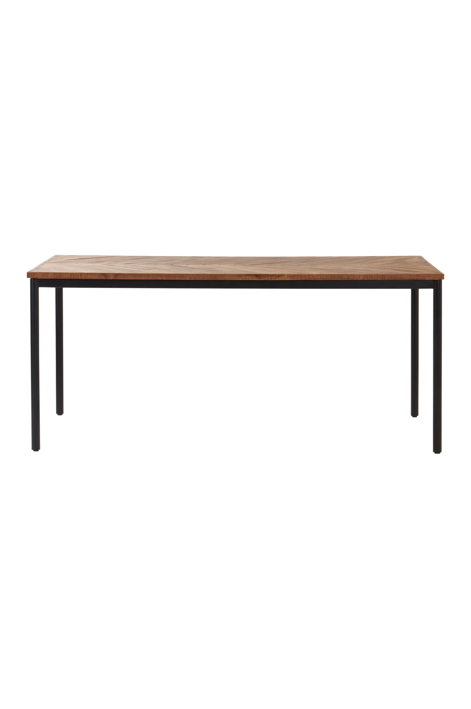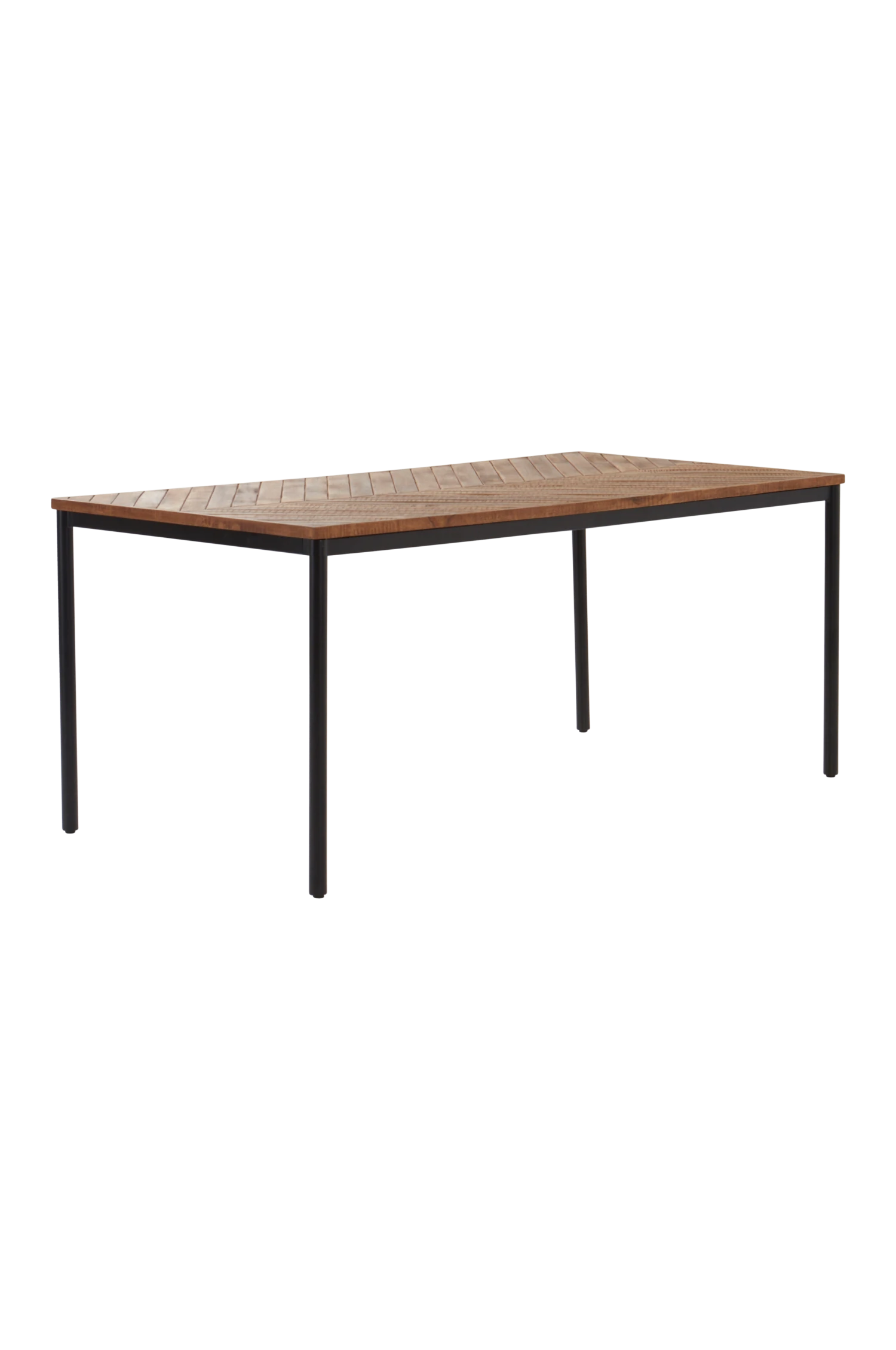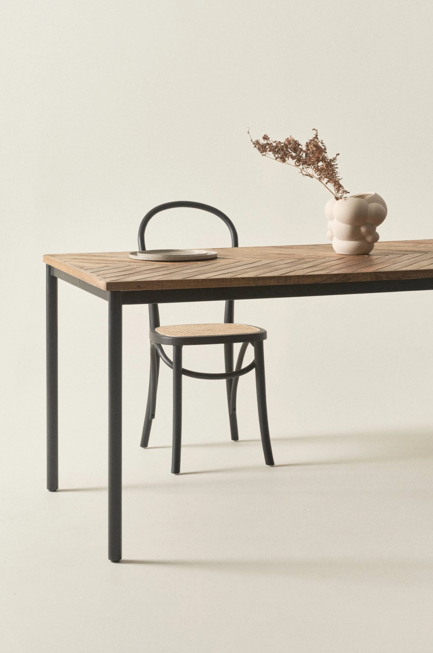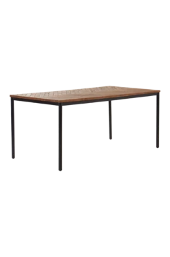 Matbord av återvunnet, FSC-märkt trä och metall. Bordsskivan har fin finish och strukturen ger intrycket av att den är uppbyggd av stavar med urfrästa spår i ytan. De runda, smäckra benen är av metall och har mattsvart lack. Viss montering krävs. Monteringsanvisning medföljer.
