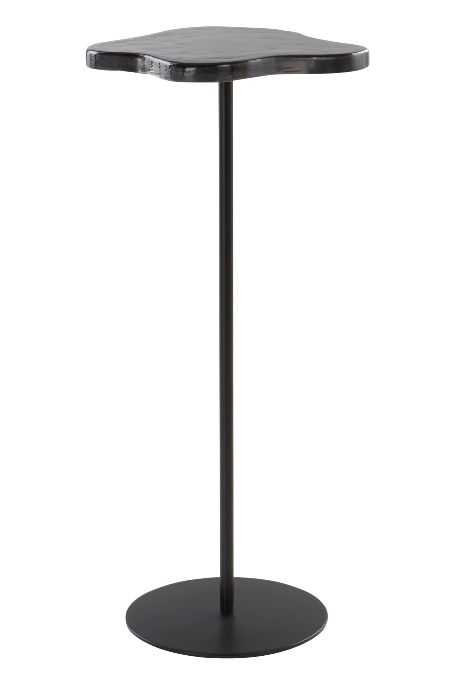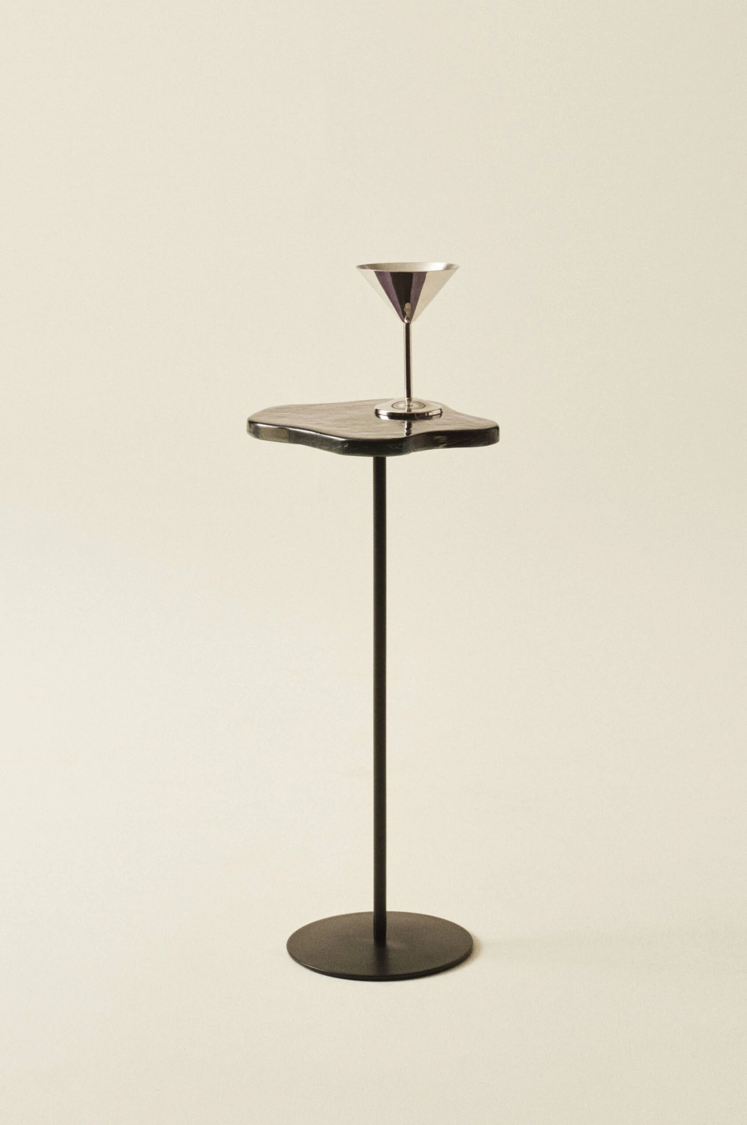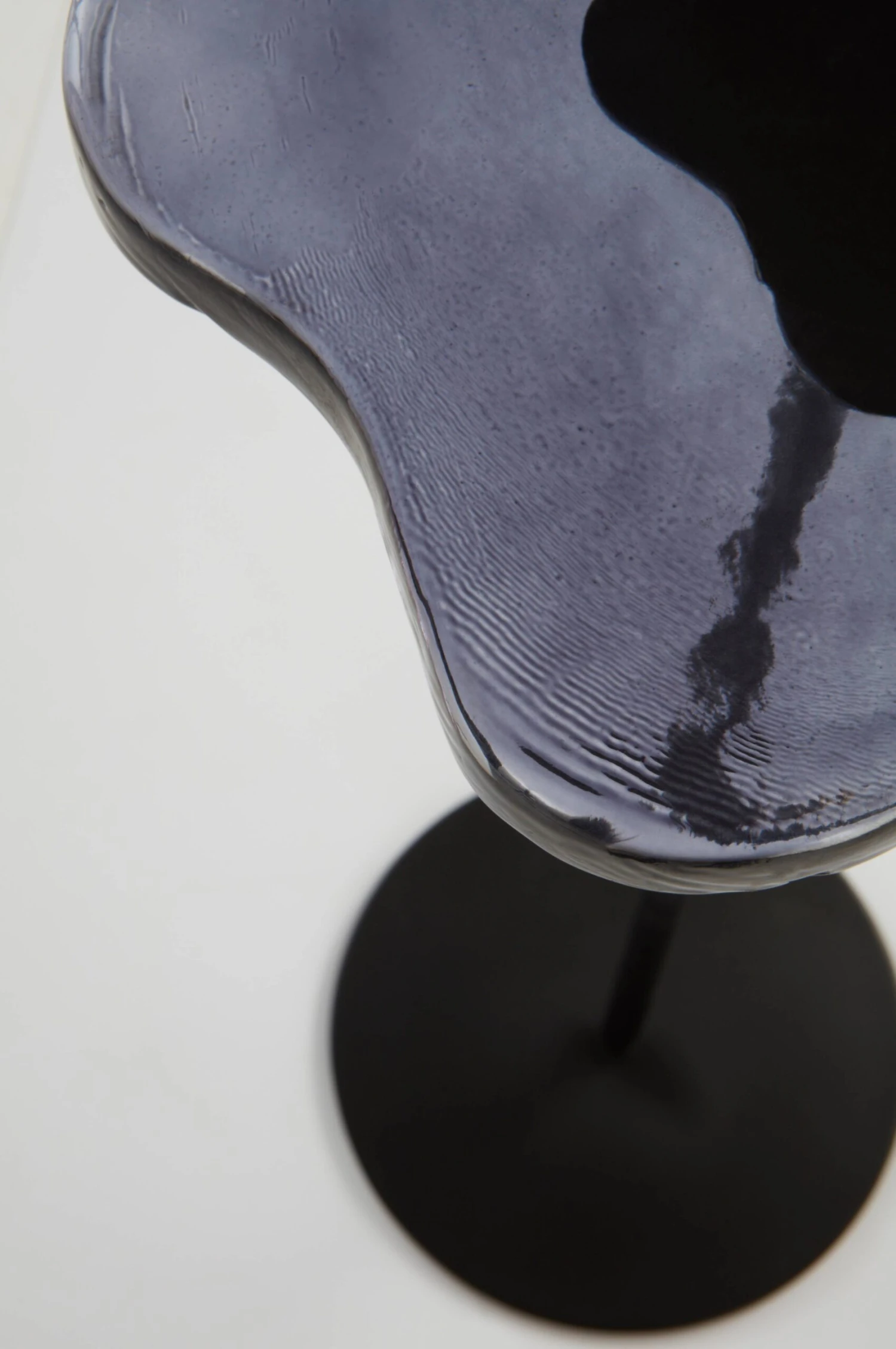 SAKSUN är ett nätt, stiligt sidobord med pelarfot av järn och på den vilar en vacker, lätt transparent bordsskiva av blåaktigt glas. Bordsskivan har böljande och oregelbunden form och färgen är magisk, med lätt struktur som gör att färgen skimrar. Foten har pulverlackerad yta.