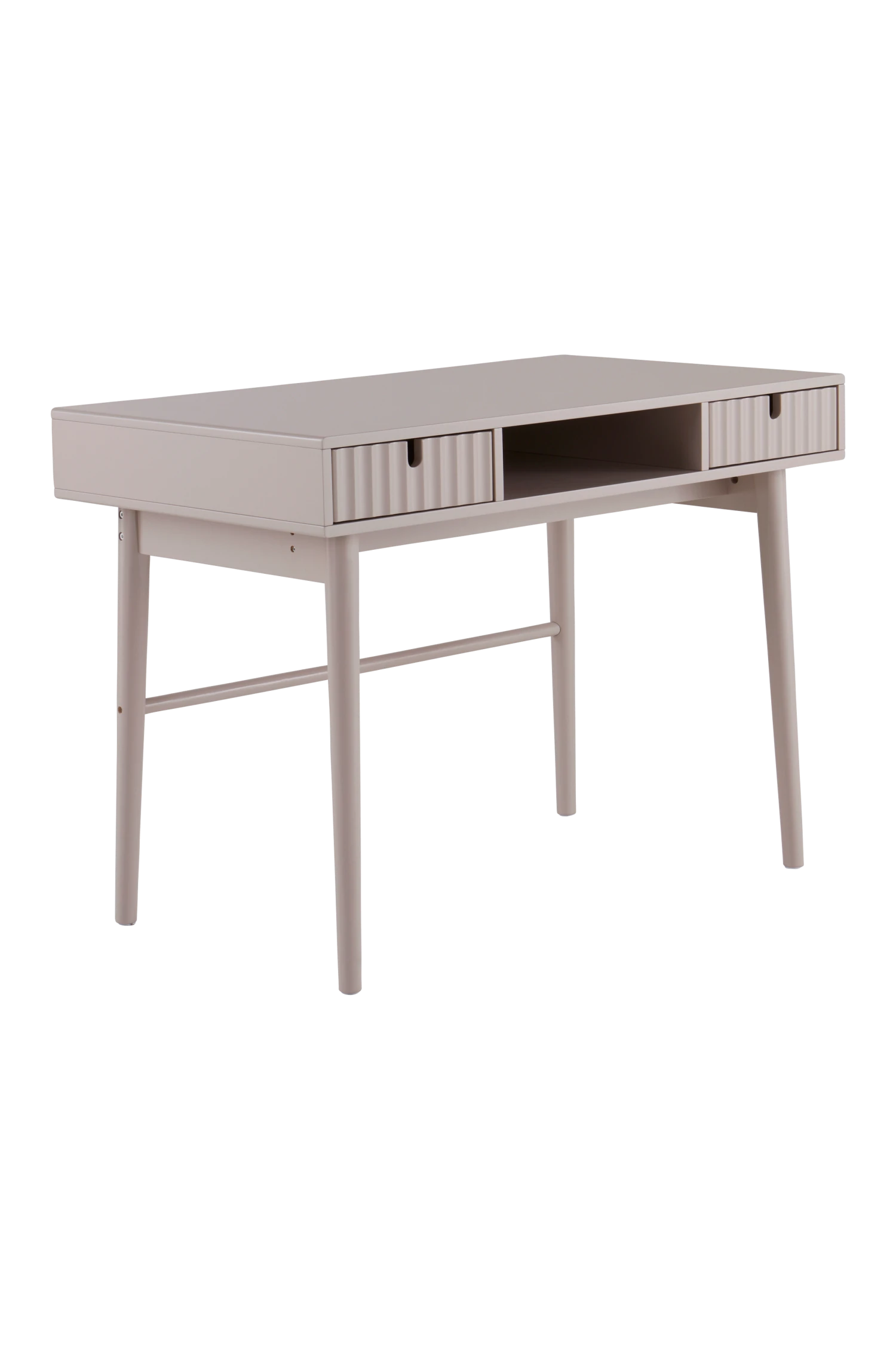 Skrivbordet har två lådor och en öppen hylla under bordsskivan. Lådorna har ett u…
