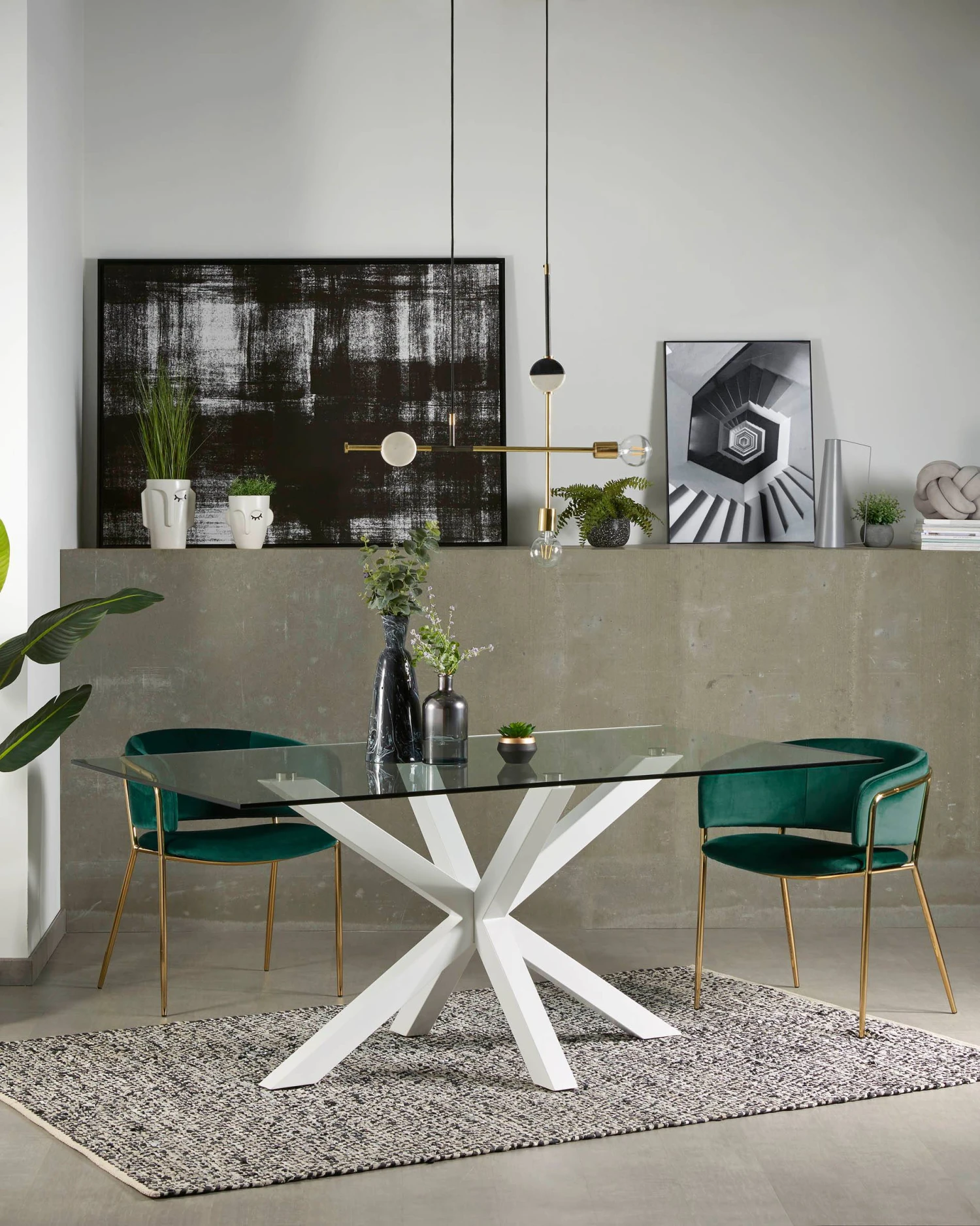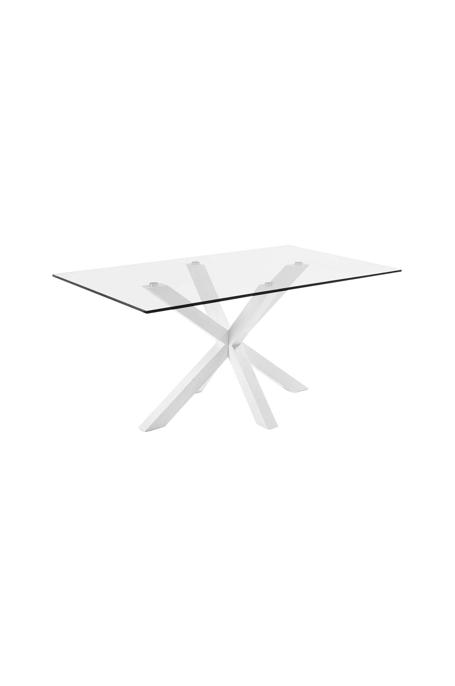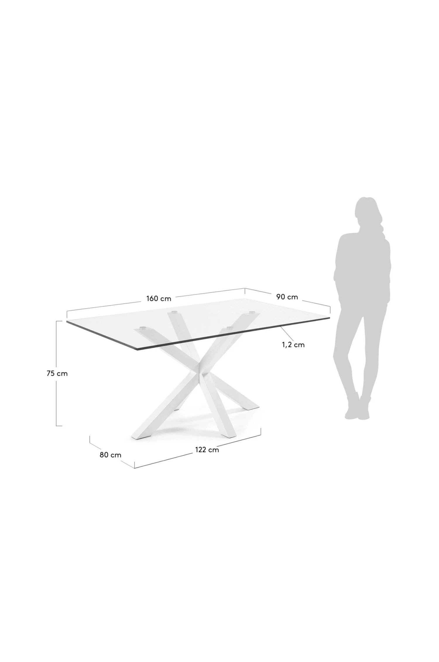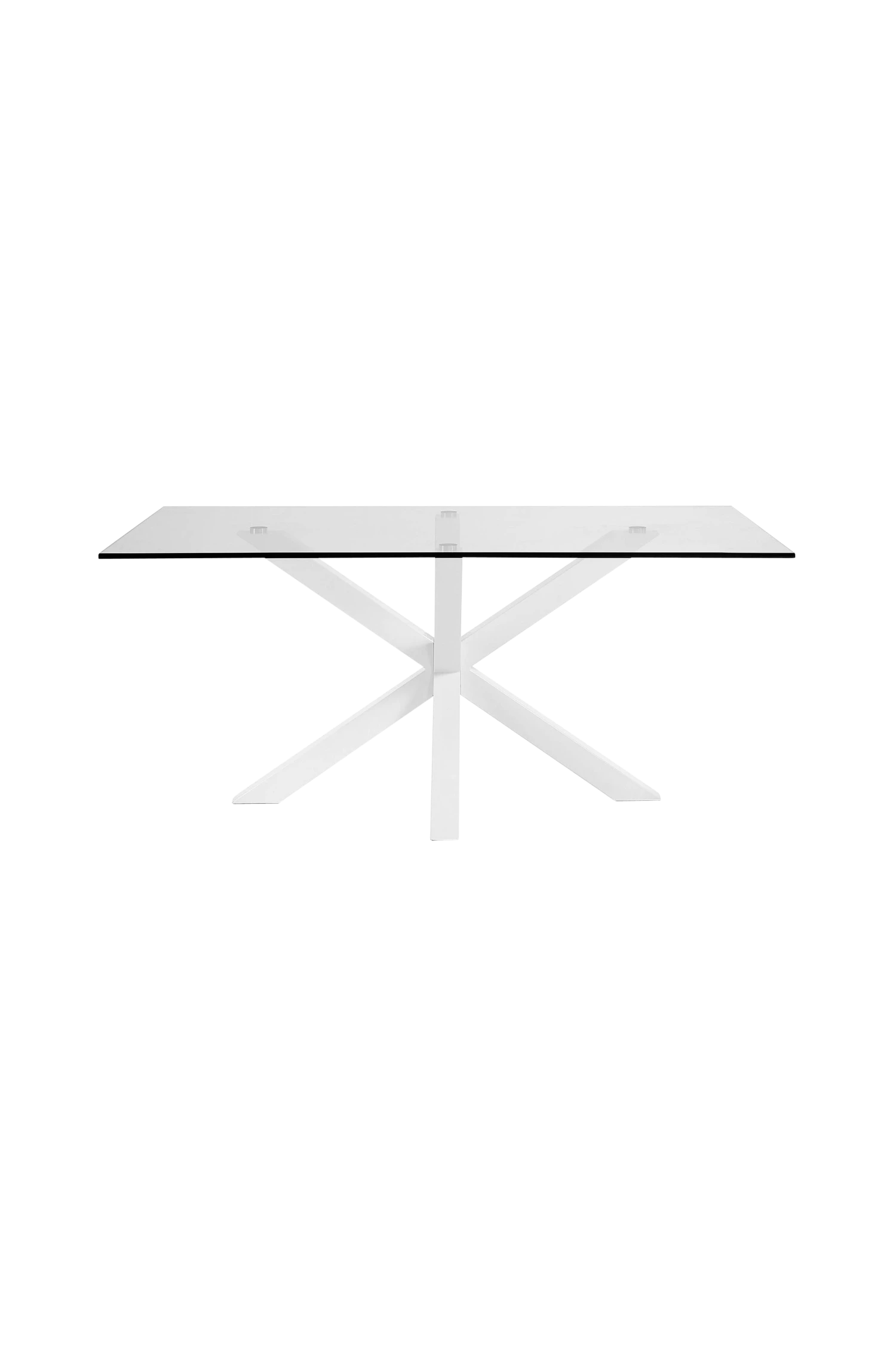 Matbord med ben av exposimålat stål och bordsskiva av härdat glas. Bredd: 160 cm. Djup: 90 cm. Höjd: 75 cm.