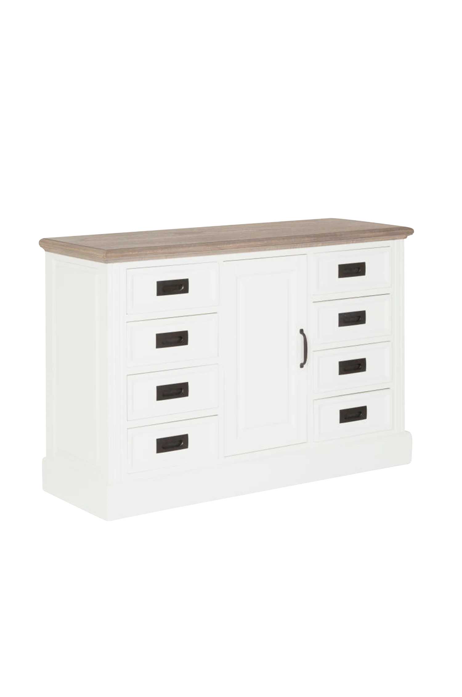 Malou är en vacker antik serie i många delar. Denna skänk har 8 lådor och en dörr i mitten skänken har en fin antik topp.