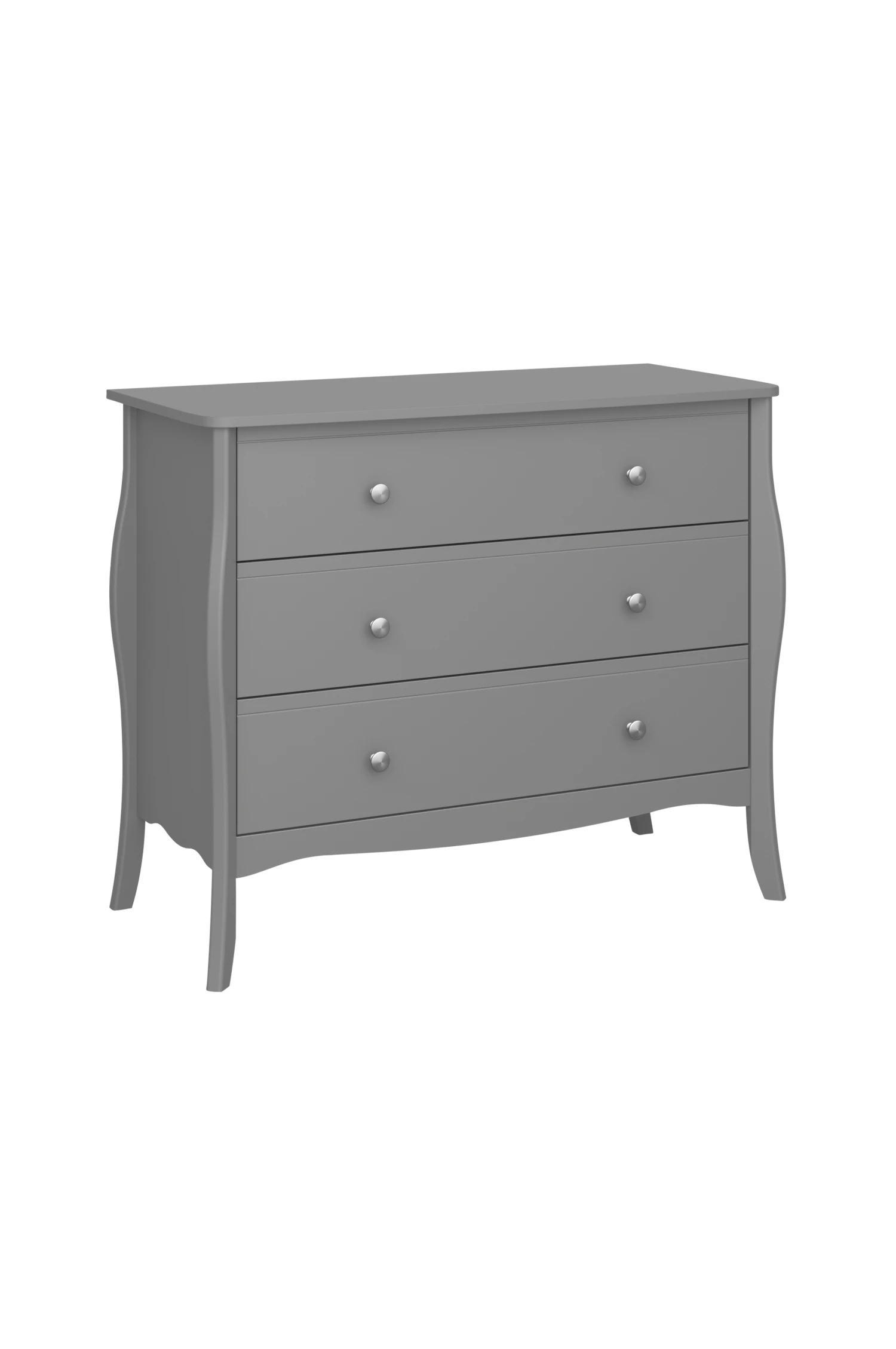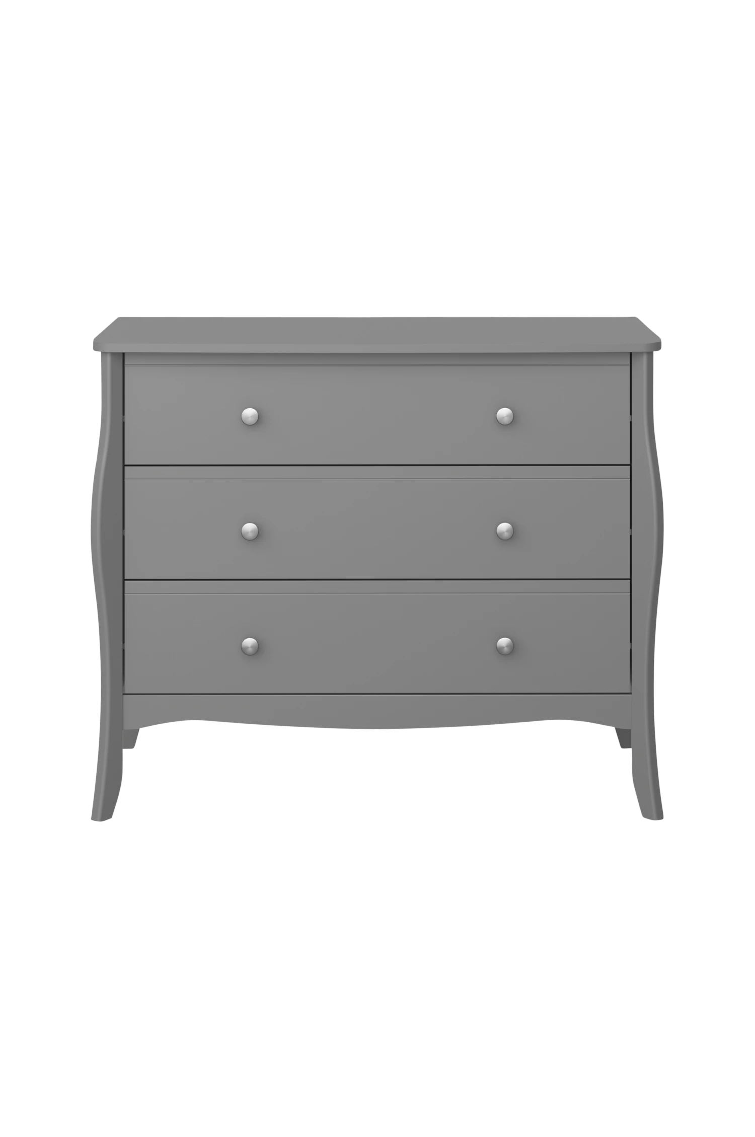 Byrå med formade ben och 3 breda funktionella lådor tillverkade i en kombination av MDF och massiv tall med en fin lackerad yta. Enkel självmontering.