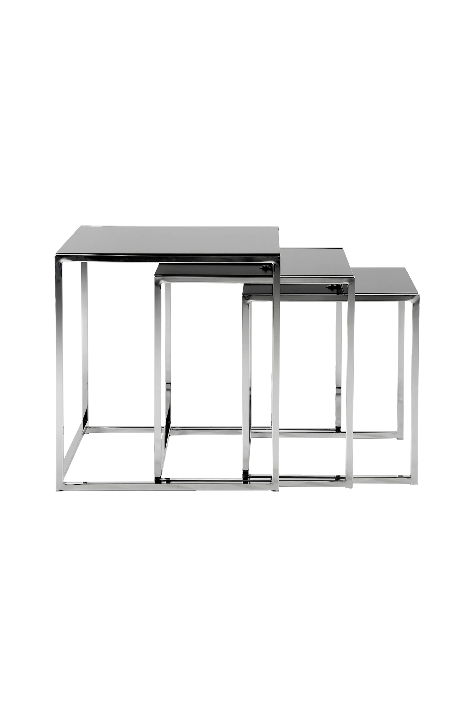 Satsbord Lovise. Kromat underrede och rökfärgat glas 8 mm. Set om 3 bord. Mått; Stora bordet 50 x 50, höjd 55 cm. Mellan bordet 45 x 45, höjd 50 cm. Lilla bordet 40 x 40, höjd 45 cm. Montera själv.