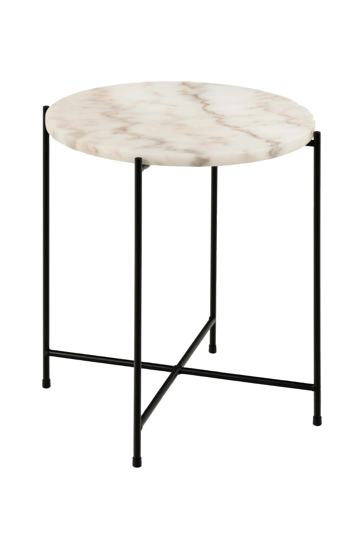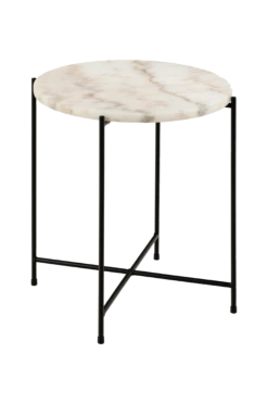 Detta sidobord med bordsskiva av vit marmor må vara litet, men det är verkligen mäktigt. Ådringen i olika nyanser som löper genom den polerade stenen gör produkten till ett mästerverk eftersom inga två är exakt likadana – det har naturen sett till. För att fullborda stilen är den runda bordsskivan placerad på en smal, svart, pulverlackerad metallstomme. Ett sådant sidobord gör utan tvekan ett kraftfullt intryck i alla typer av inredningar.