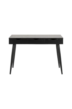 Skrivbord med tre lådor på glidskenor av metall, Askfanerad melamin. Ben av matt lackad metall. Mått; 50 x 110, höjd 77 cm. Levereras omonterat.
