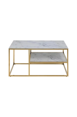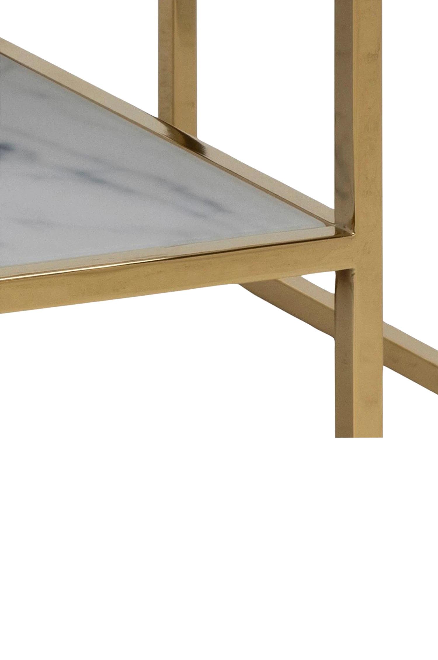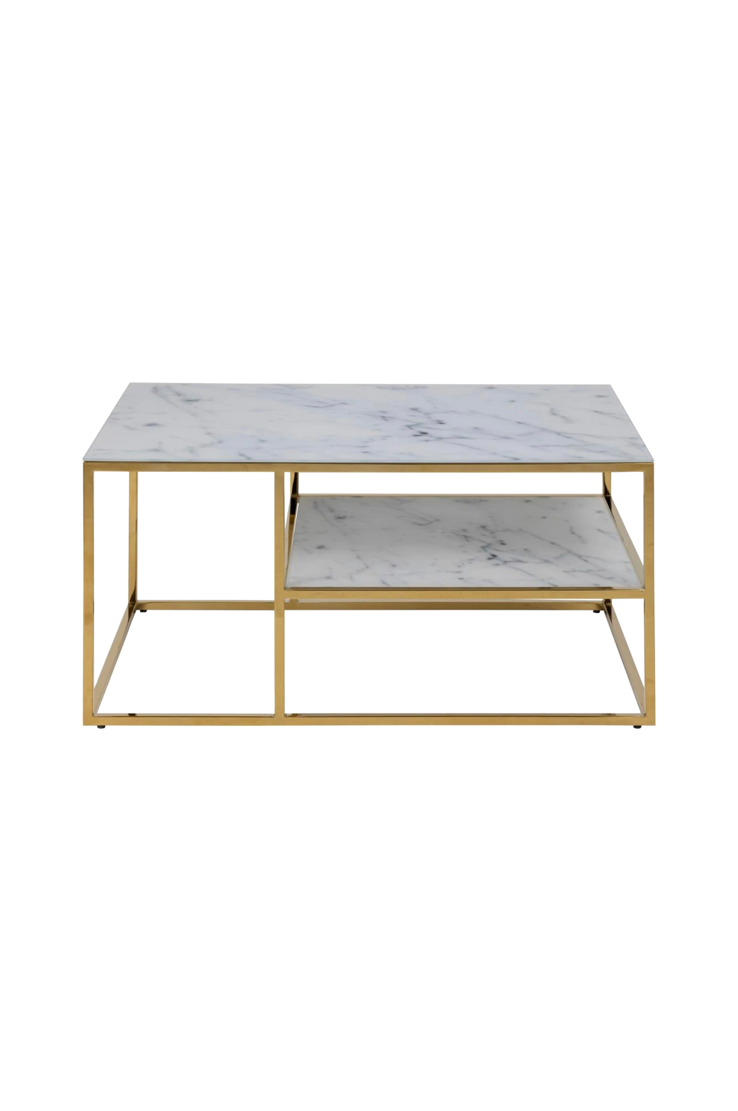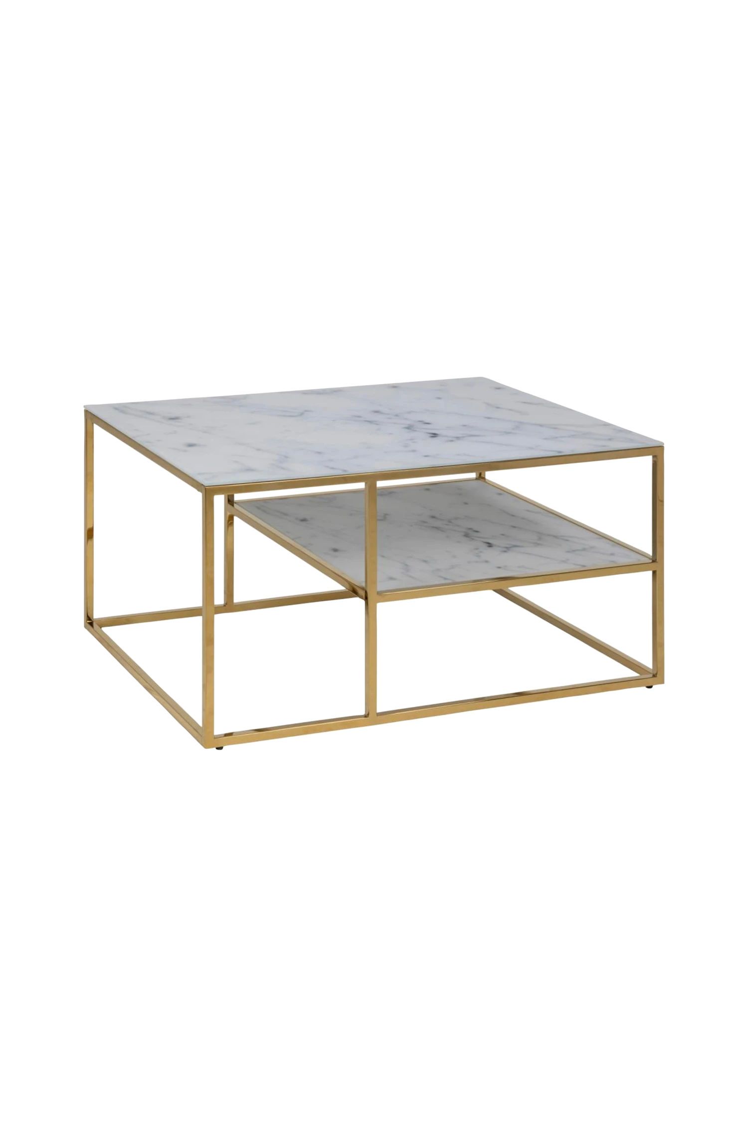 Detta glamourösa soffbord är både modernt och kraftfullt. Stomme av guldfärgat krom och vit, marmorliknande bordsskiva. Använd nedre bordsskivan för böcker och tidningar, samtidigt som hemmet får en lyxig känsla. De noggrant utvalda materialen är lättskötta – rengör produkten enkelt med glasrengöringsmedel och torka av med en mikrofiberduk.