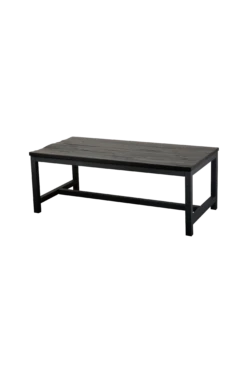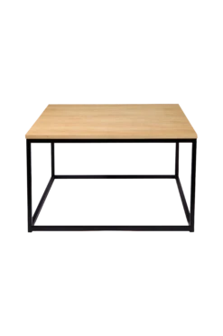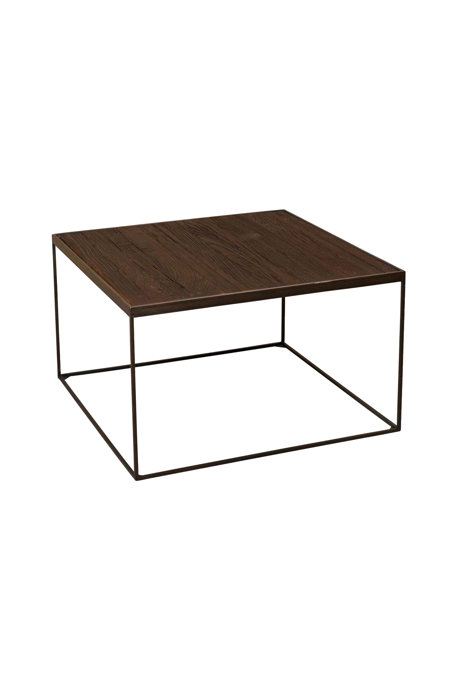 Soffbord med topp i rustik vaxad alm och underrede i borstad stål. Monterad. Höjd: 40 . Bredd: 80. Djup: 80 cm. Material: recycled elm/metal/PU