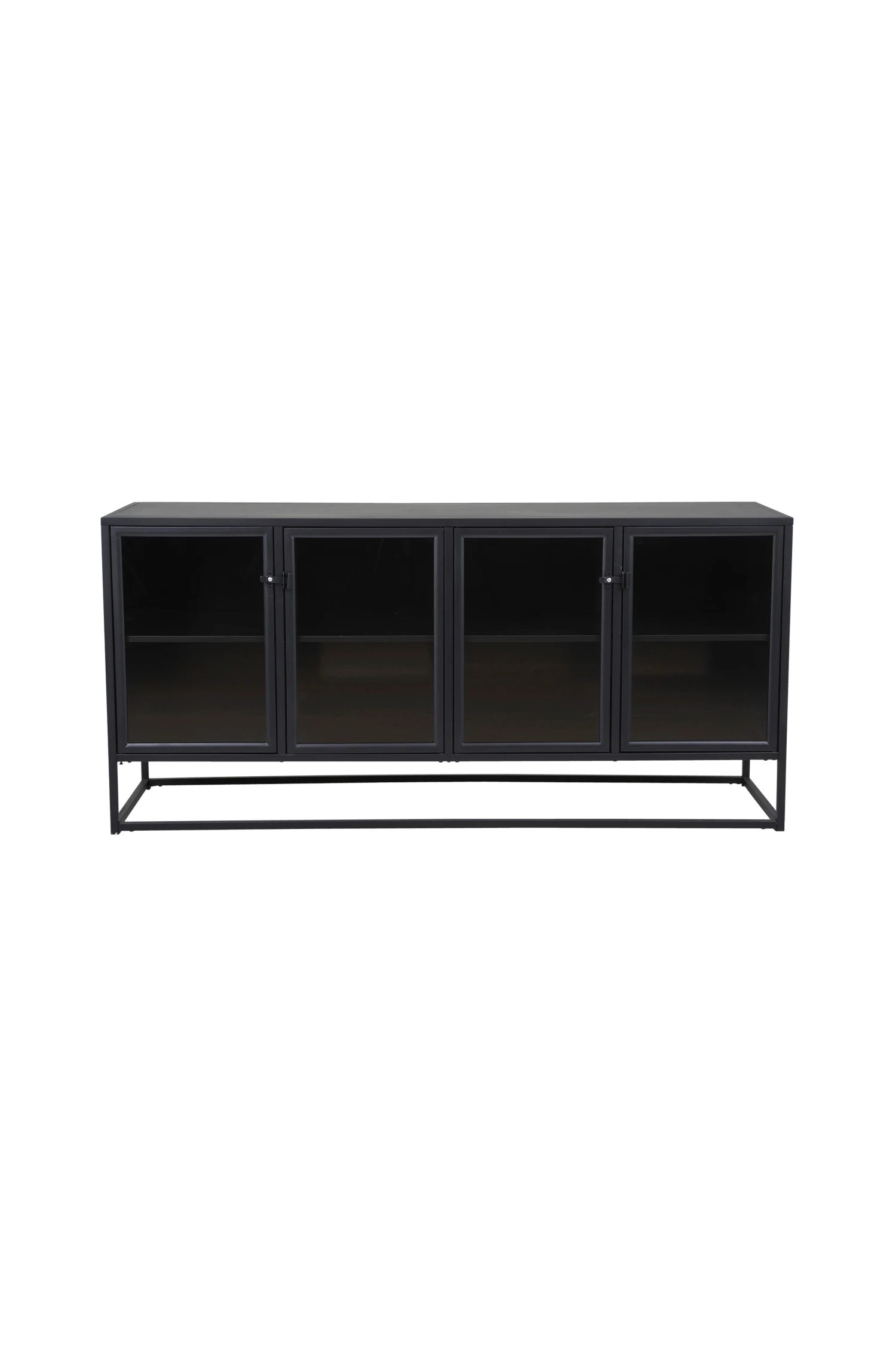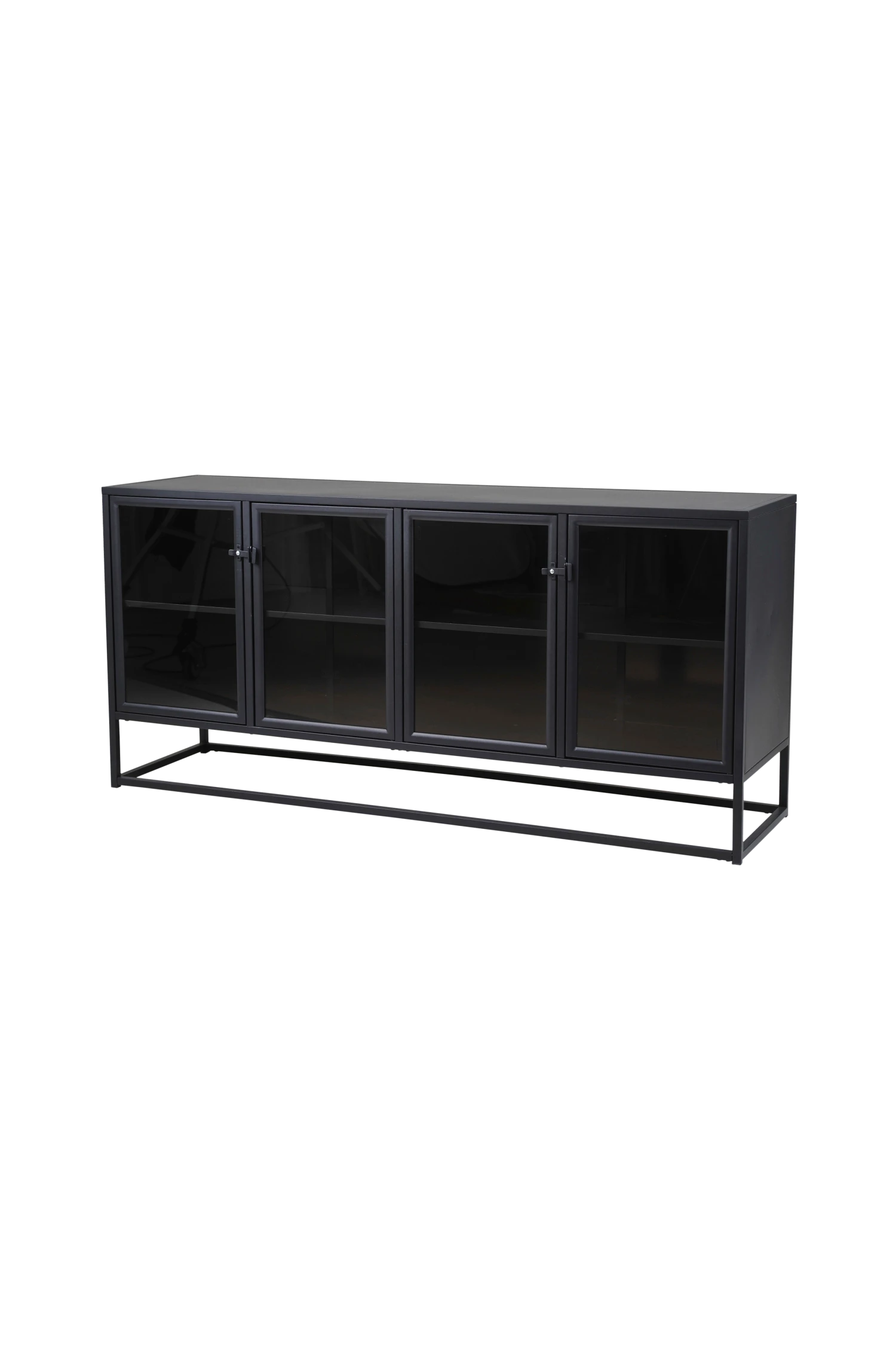 Sideboard i metall – tuff industrilook. Härdat glas. 4 Dörrar. Säljs i 1-pack. Bredd 167,50 cm, djup 45 cm och höjd 78,5 cm. Montera själv.