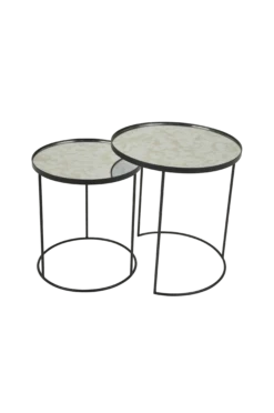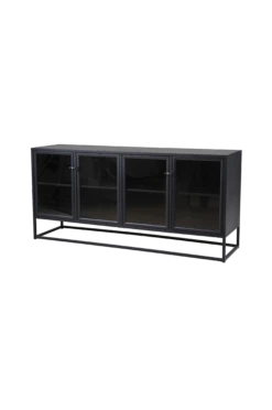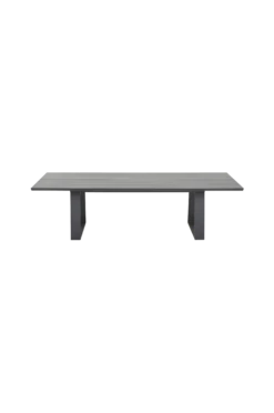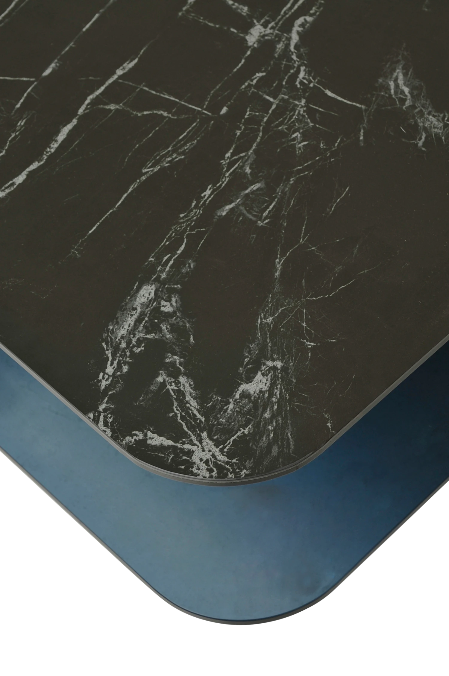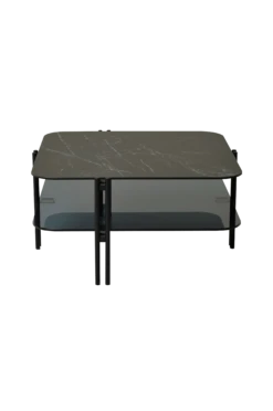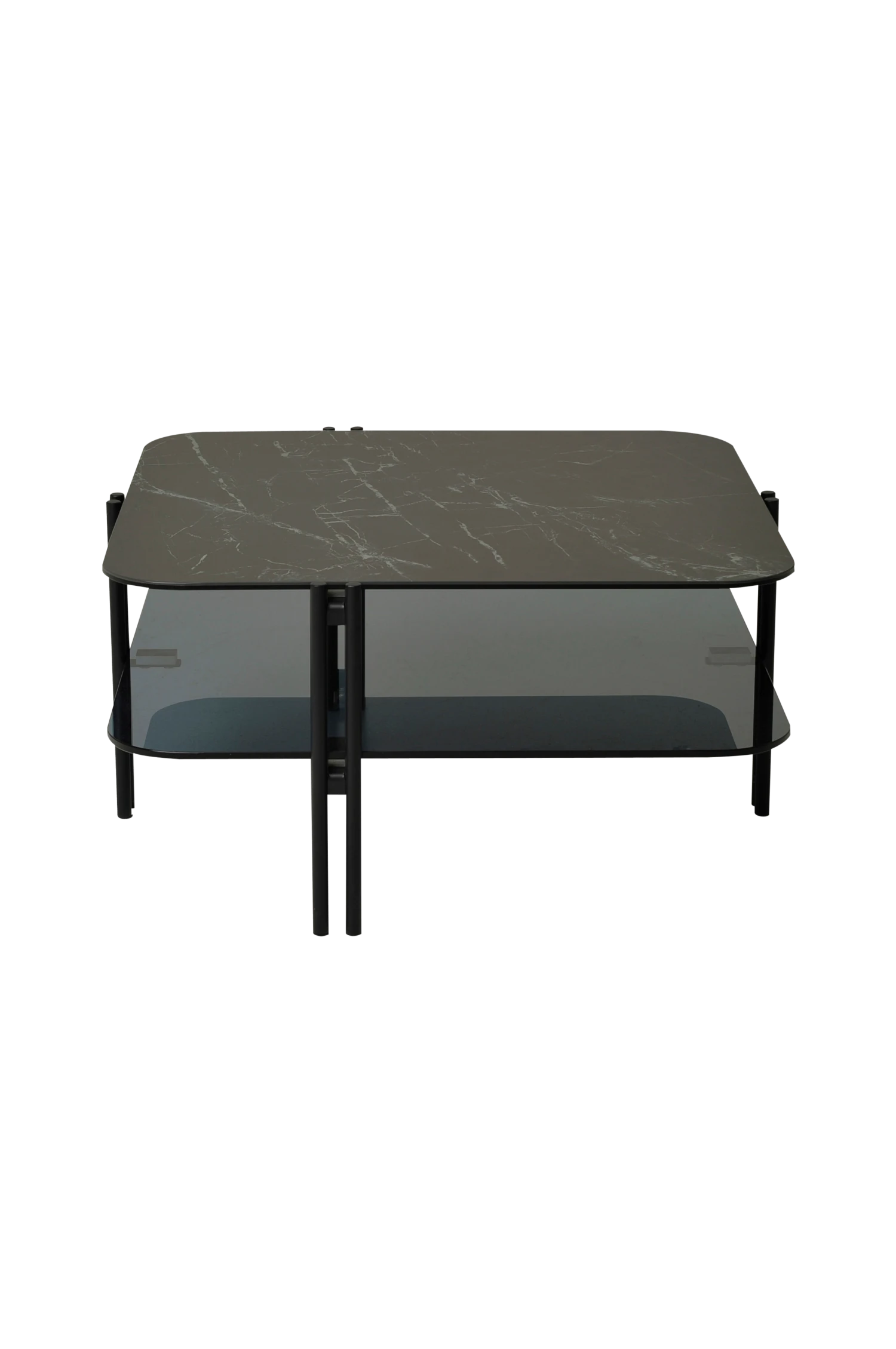 Fint soffbord i svart keramik och härdat rökfärgat glas. Lackerade metallben. Bredd 80 cm, djup 80 cm och höjd 42 cm. Omonterad.