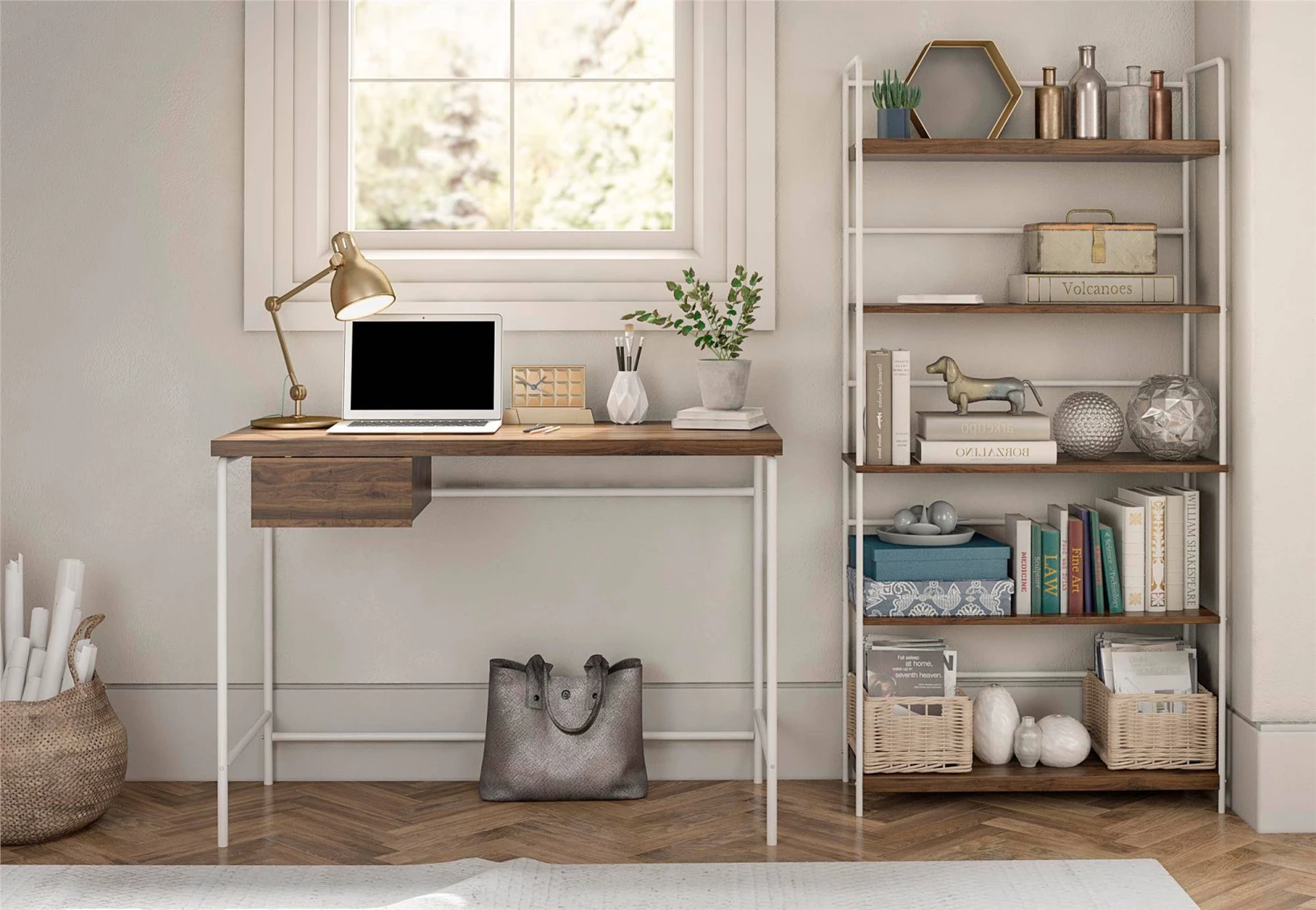 Med datorbordet Webster Computer Desk Novogratz får du värdefull arbetsyta även i den lilla hemmakontoret. Den klassiska valnötsfinishen i kombination med metallramen skapar en modern look som du kommer att älska. Bordsskivan är stor nog för att rymma både laptop och papper, så att du kan jobba eller göra läxorna med stil. Och du håller enkelt arbetsplatsen prydlig genom att förvara kontorsmaterial i lådan. Den minimalistiska designen passar…