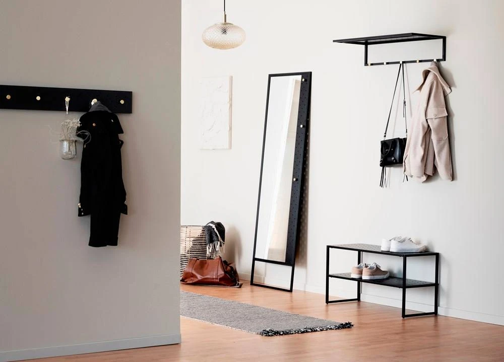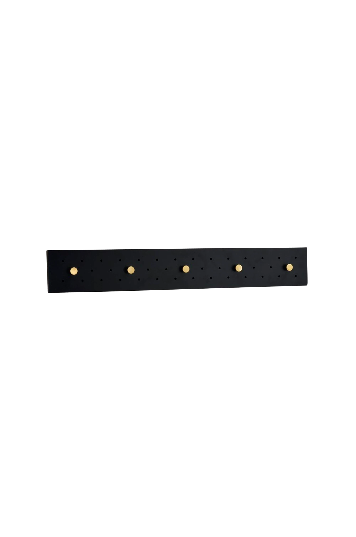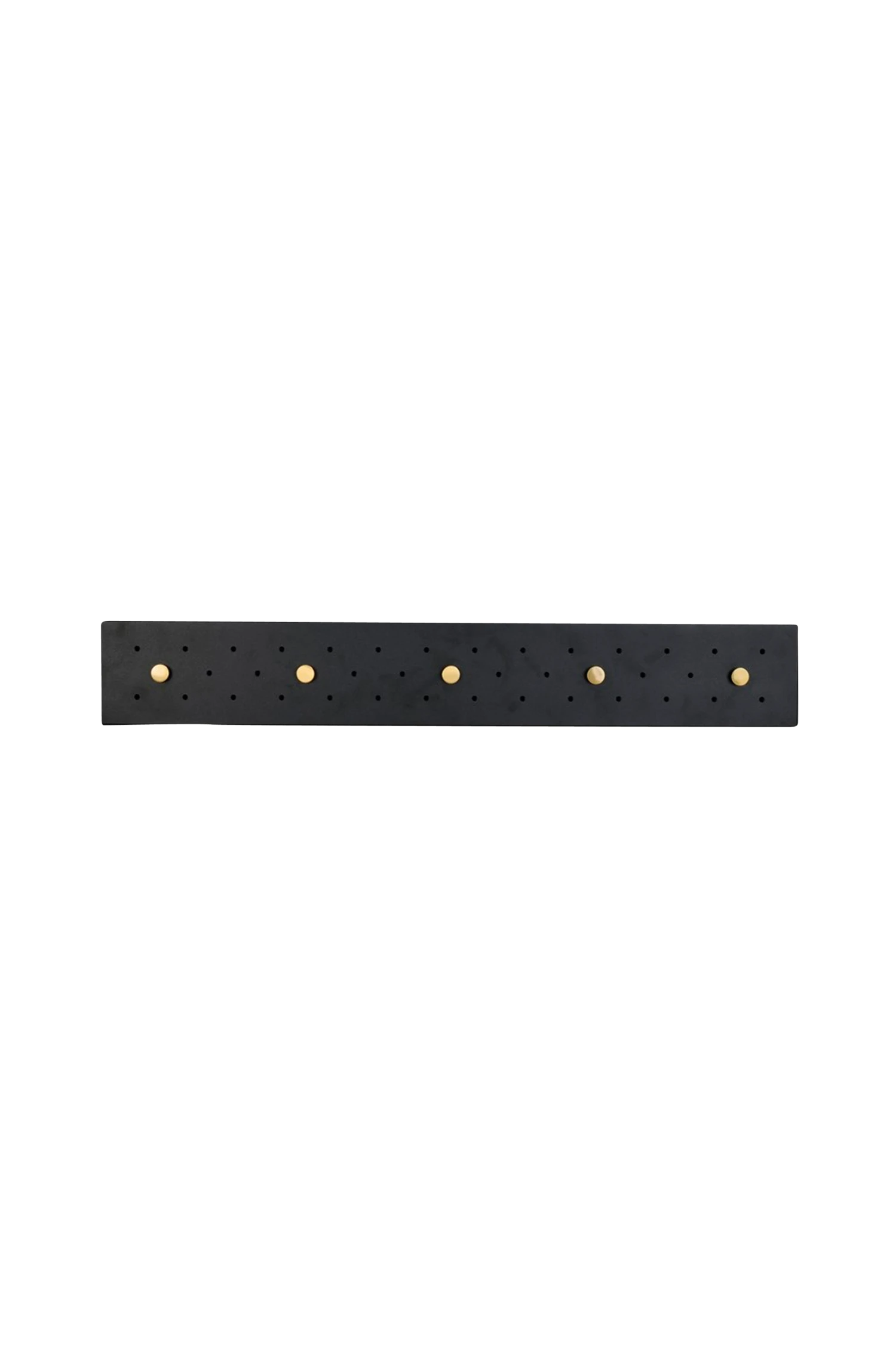 Malone kroklist i 80 cm i svart pulverlackad metall med 5 knoppar. Kroklisten är flexibel och du väljer själv var du placerar knopparna i guldfärg. Bredd 80 cm, höjd 12 cm, djup 2 cm. Malone är vår senaste hallserie och består av flera olika delar som passar perfekt i en modern hall.