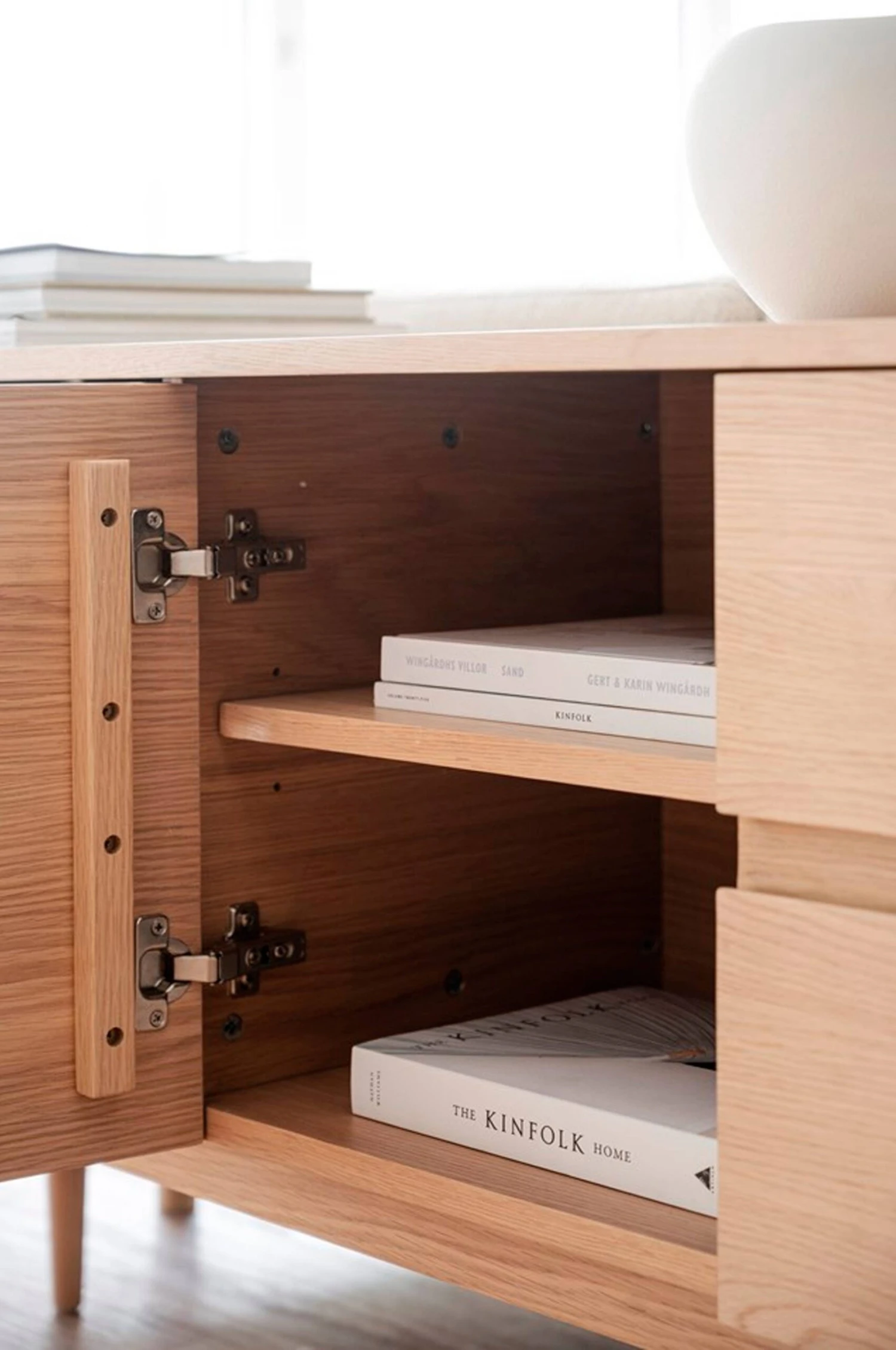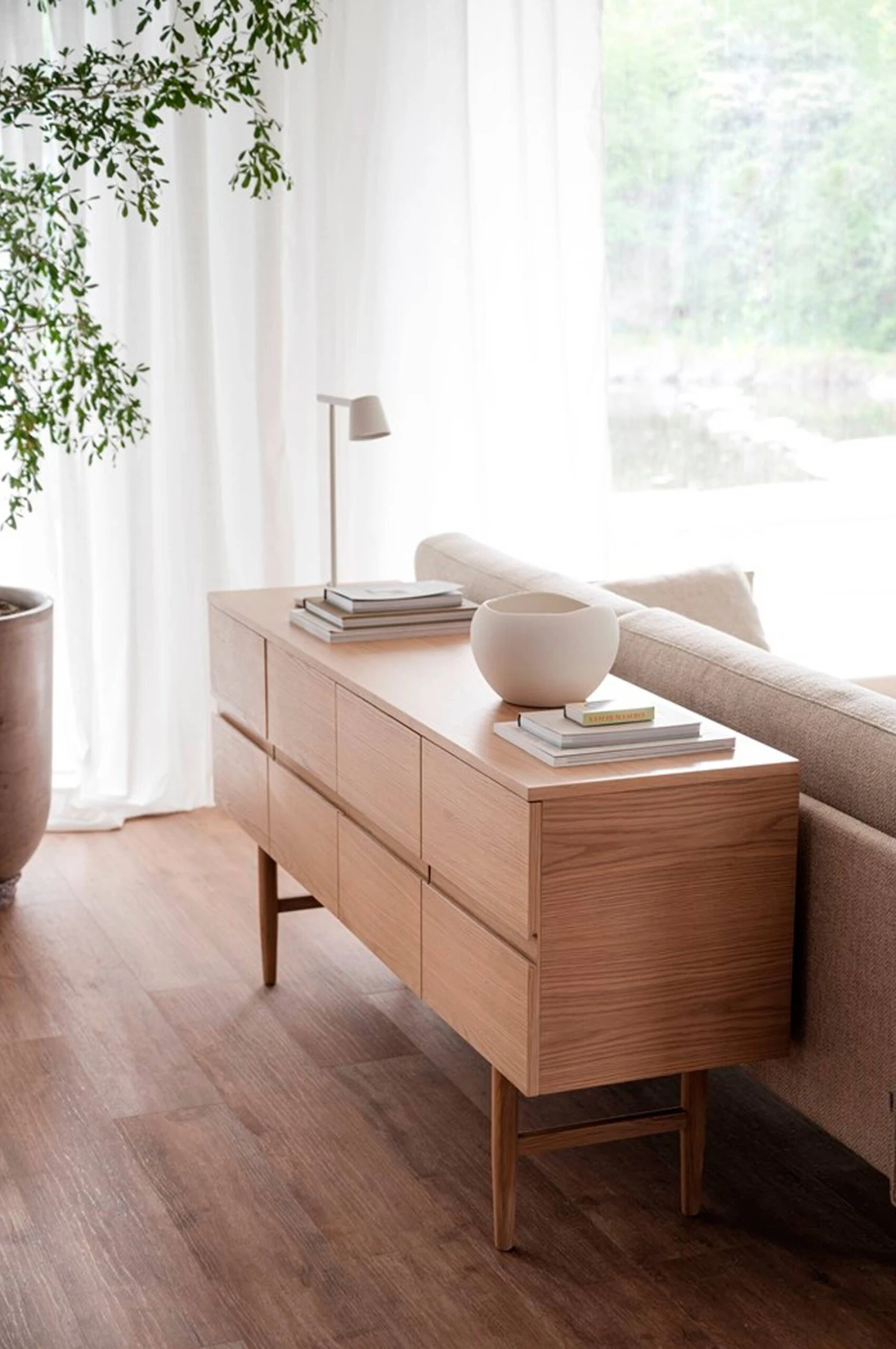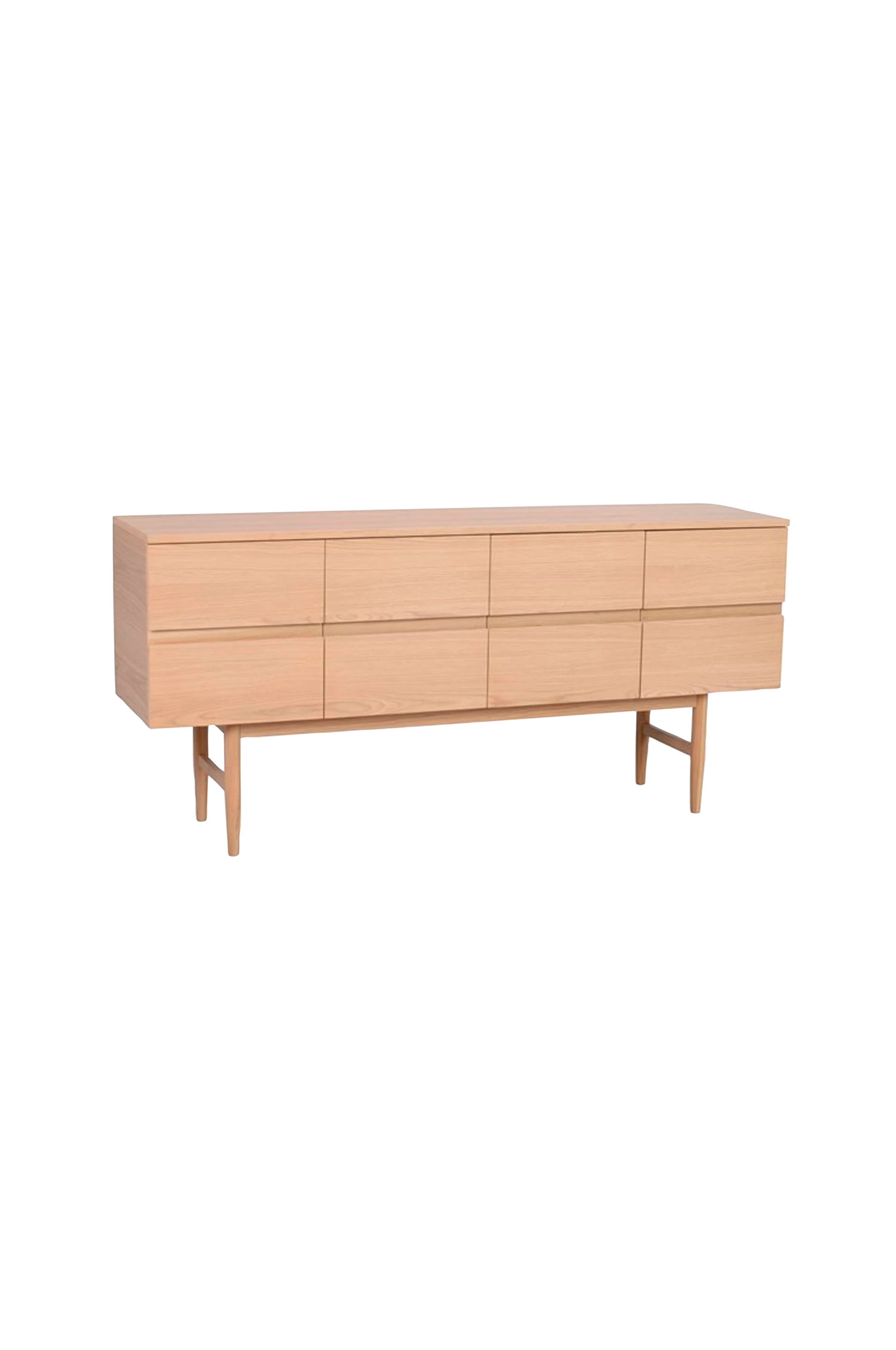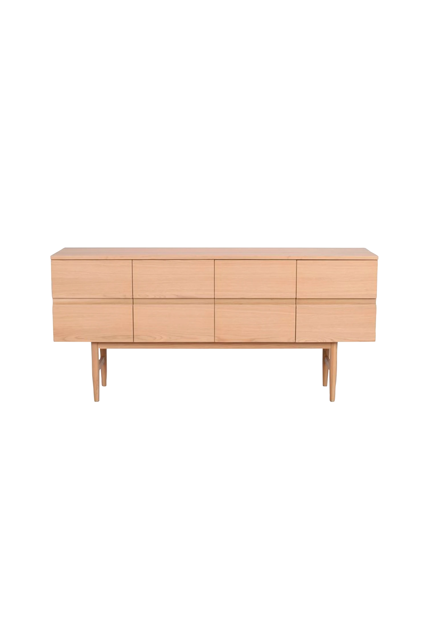 Eleganta Moresby sideboard passar både det moderna och mer traditionella hemmet och utgör ett stilsäkert blickfång. Den höga formsvarvade benställningen av massiv ek skapar ett harmoniskt och luftigt uttryck. Sideboardet har fyra mjukstängande dörrar och flyttbara hyllplan. I serien ingår även en tv-bänk.