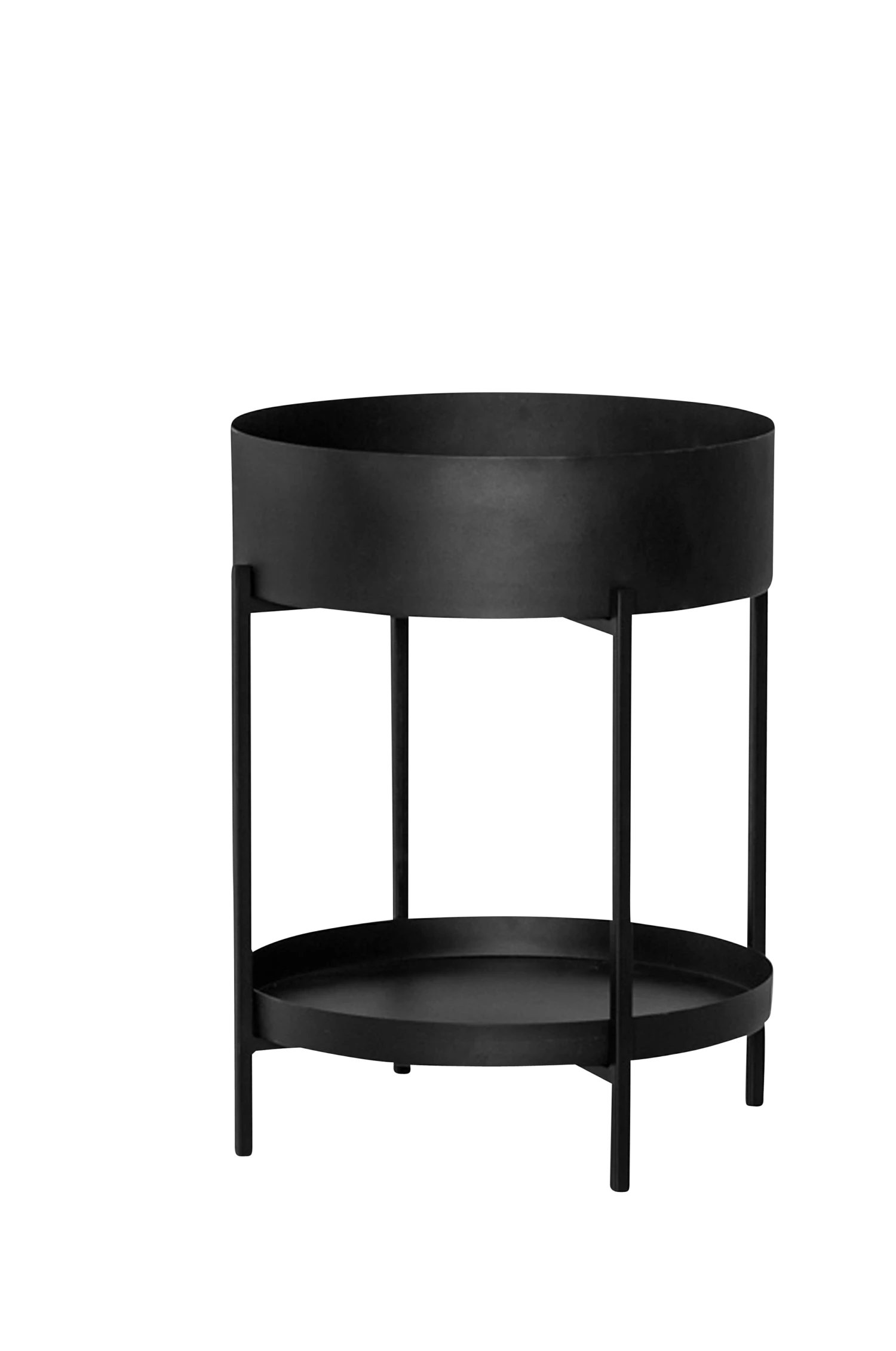 Brickbord i svart metall. Du väljer själv plats på brickorna, uppe eller nere. Bredd 50 cm. Djup 50 cm. Höjd 55 cm. Vikt 7 kg.