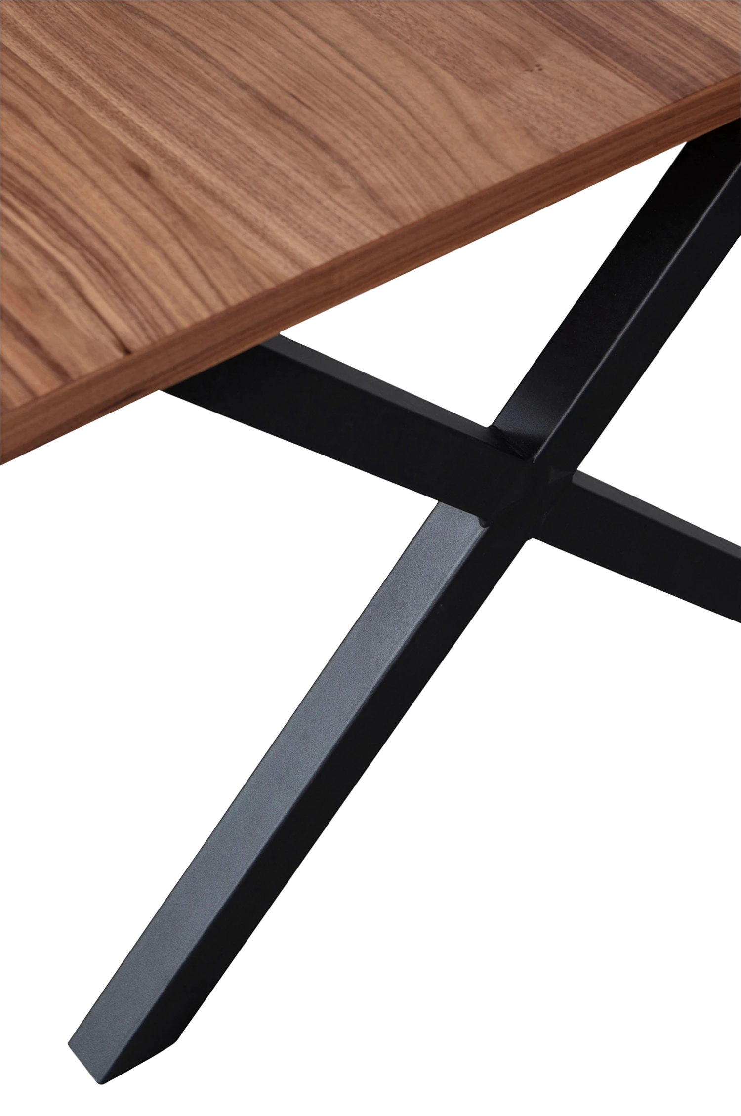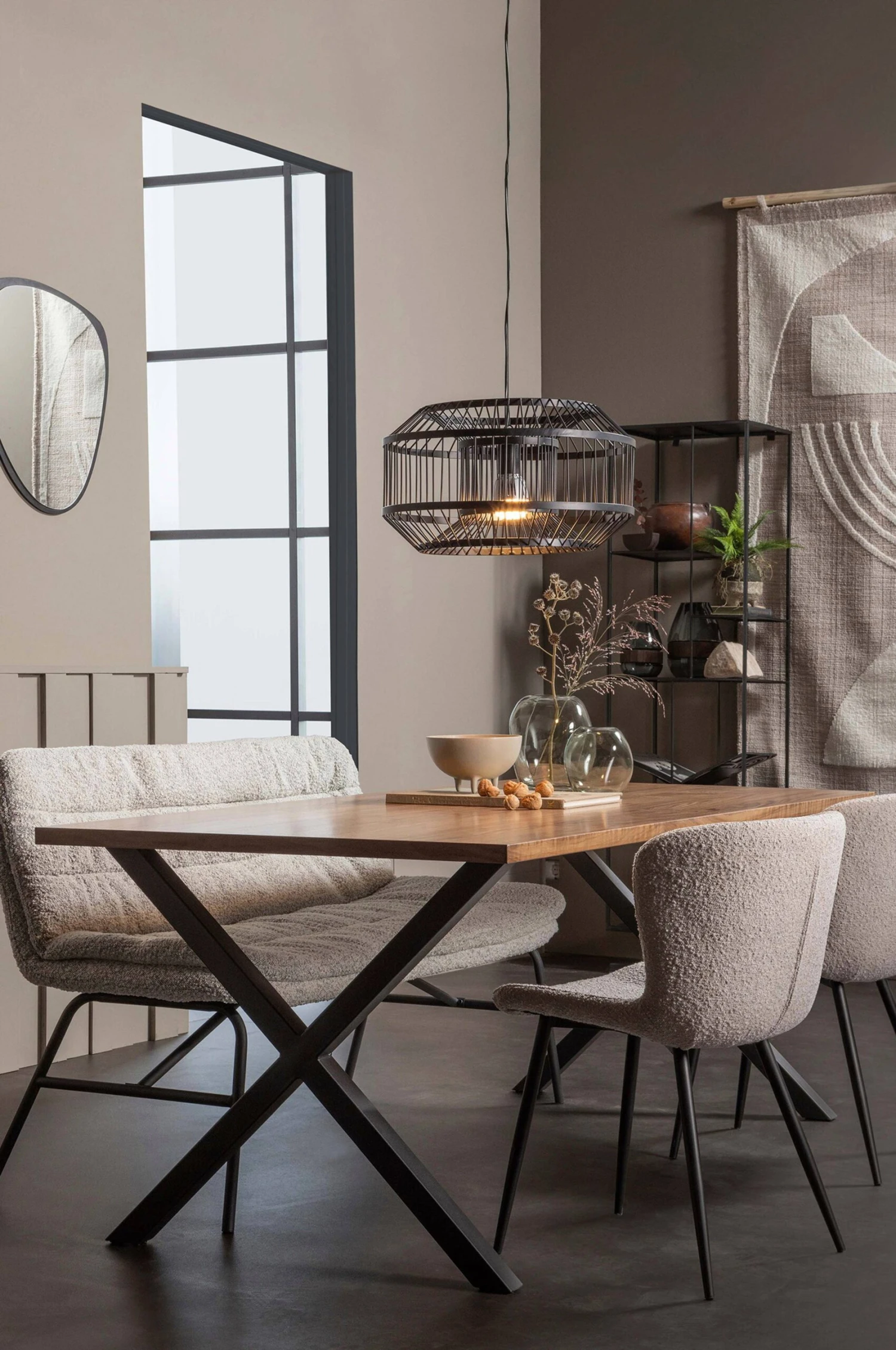 ge matgruppen värme och en fin stämning med det eleganta matbordet Jimmy! Matbordet med valnötsfaner ingår i en kollektion det nederländska inredningsmärket WOOOD och ser robust ut med en mattsvart stomme av metall. Det eleganta matbordets stora mått ger tillräckligt med plats för sex till åtta personer.