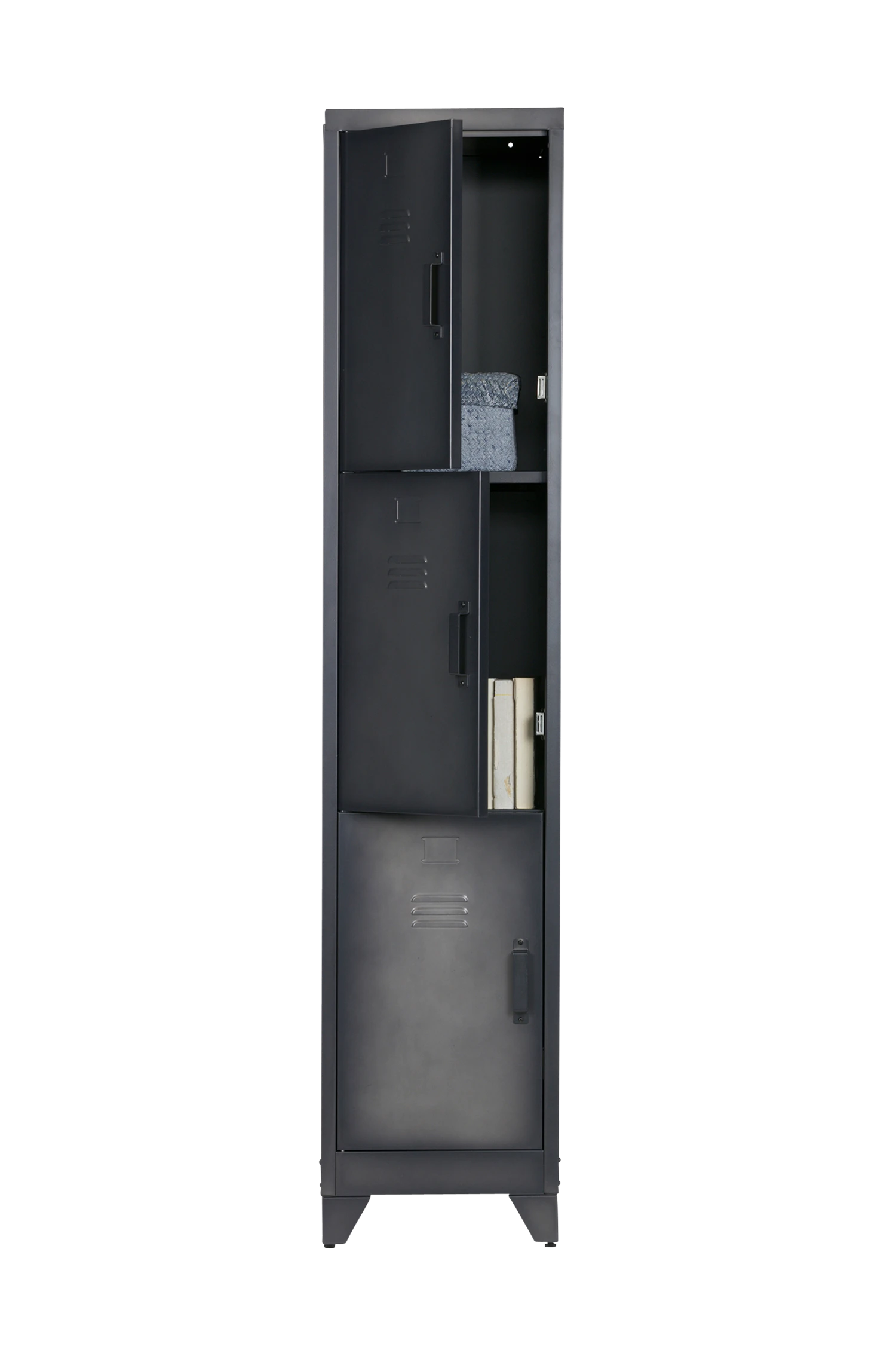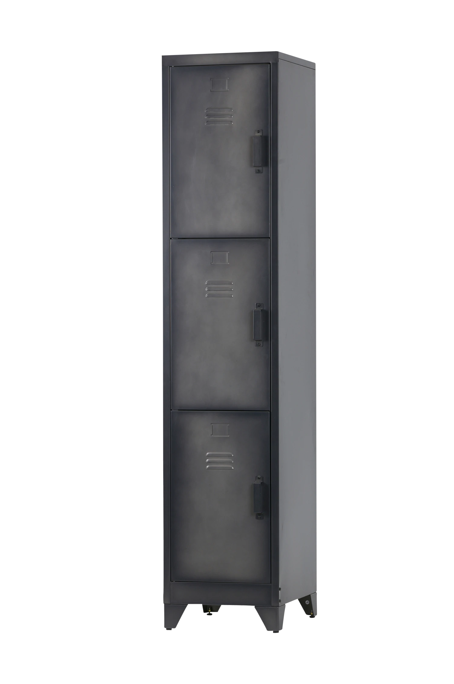 Skåpet har tre låsdörrar, bakom var och en i de tre dörrarna finns hyllplan. Detta ger Cas skåp mycket lagringsutrymme! Skåpet är tillverkat i metall.